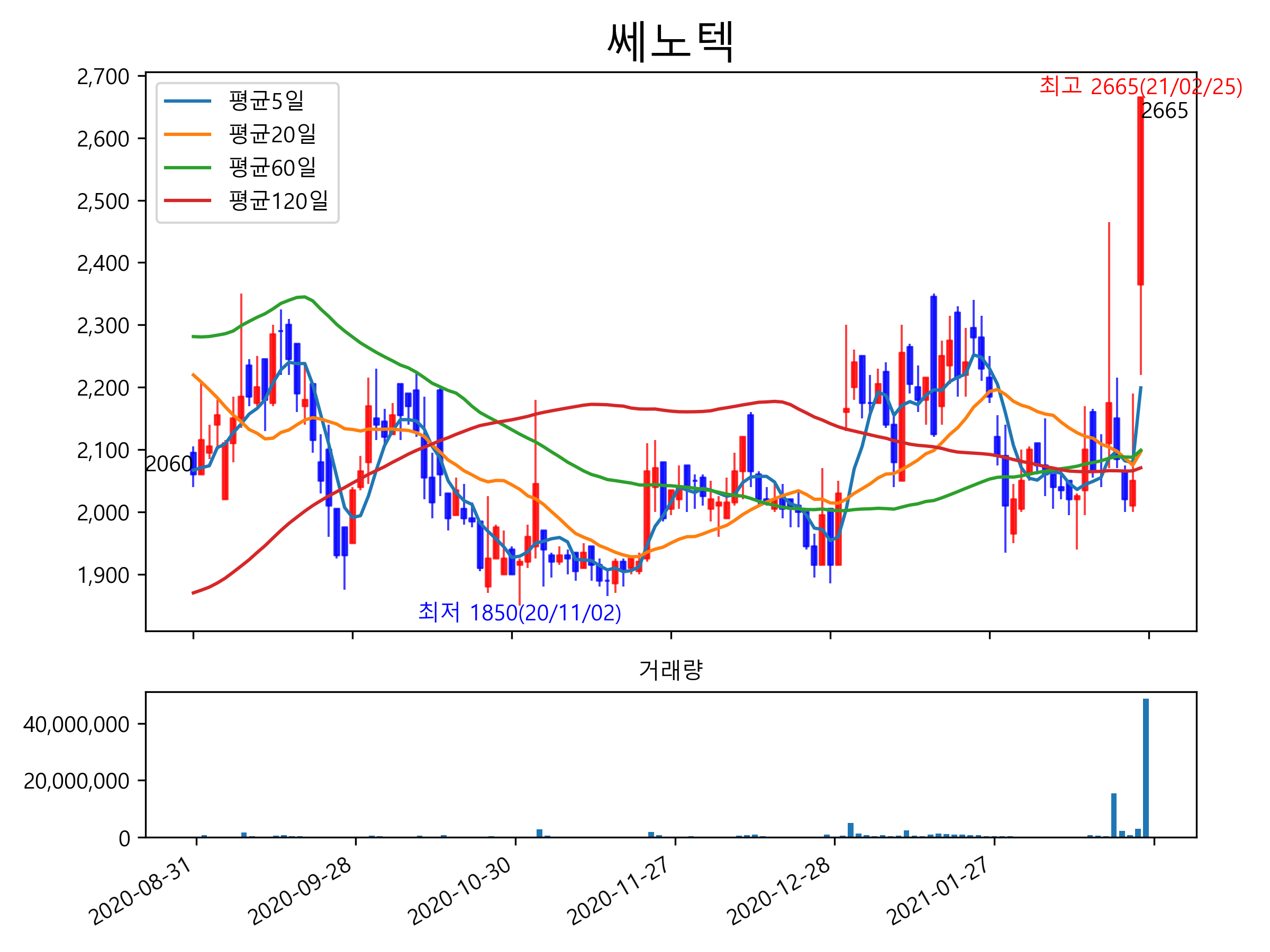 최근 6개월간 캔들차트 및 이동평균선입니다.
