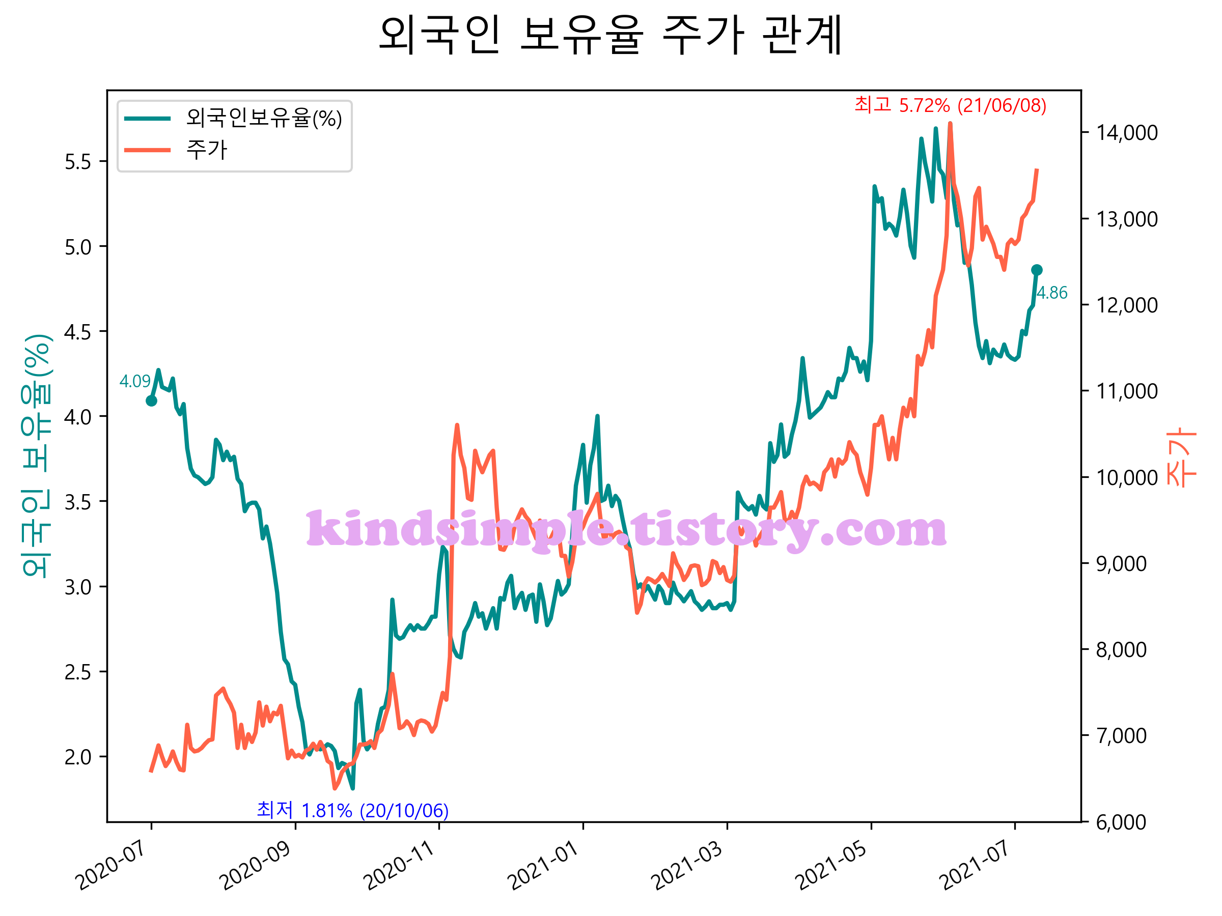 최근 1년간 외국인 보유율 및 주가와의 관계입니다.