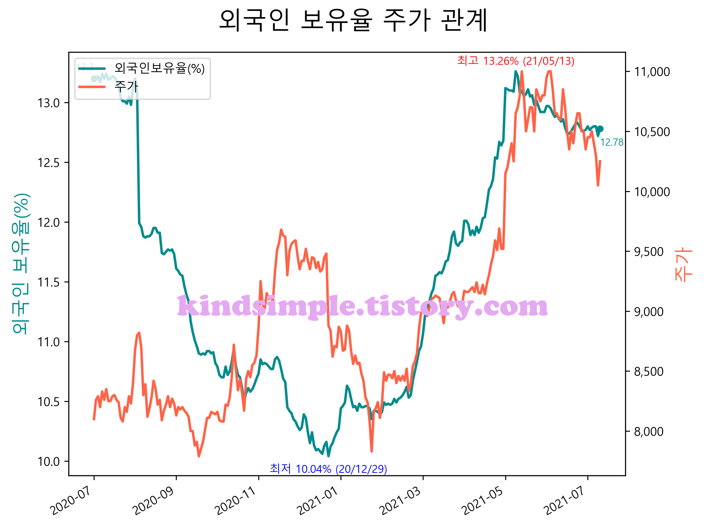 최근 1년간 외국인 보유율 및 주가와의 관계입니다.