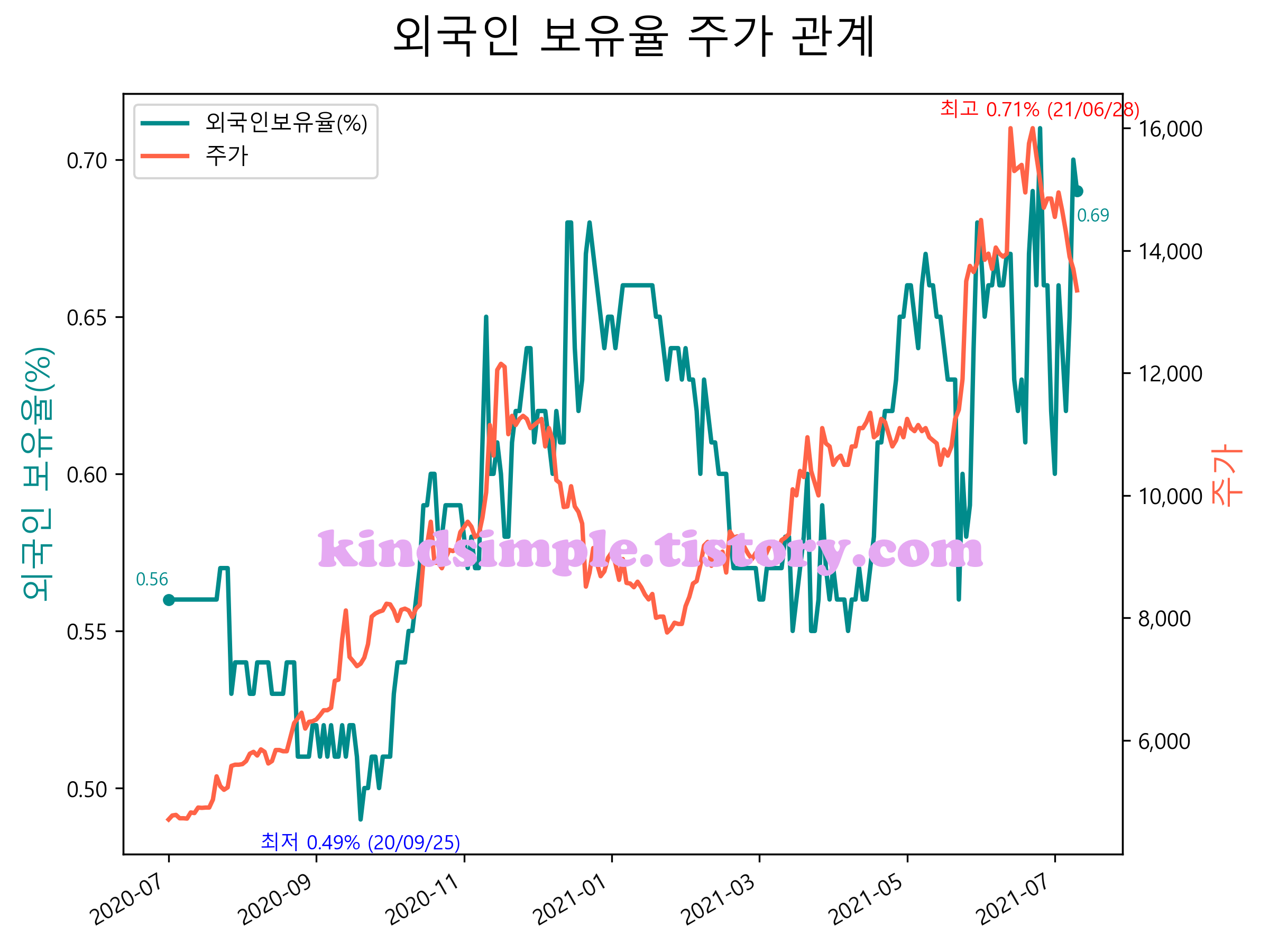 최근 1년간 외국인 보유율 및 주가와의 관계입니다.
