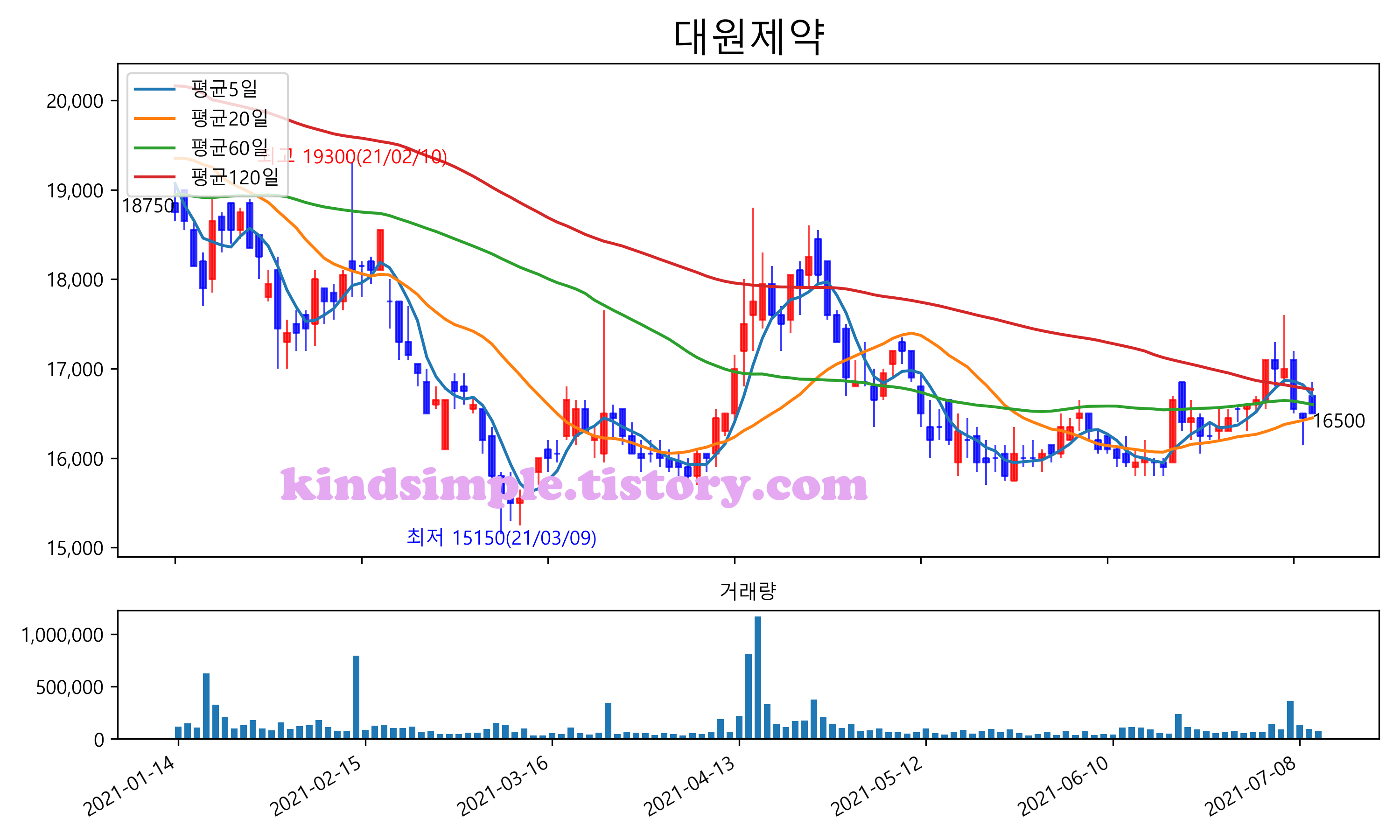 최근 6개월간 캔들차트 및 이동평균선입니다.