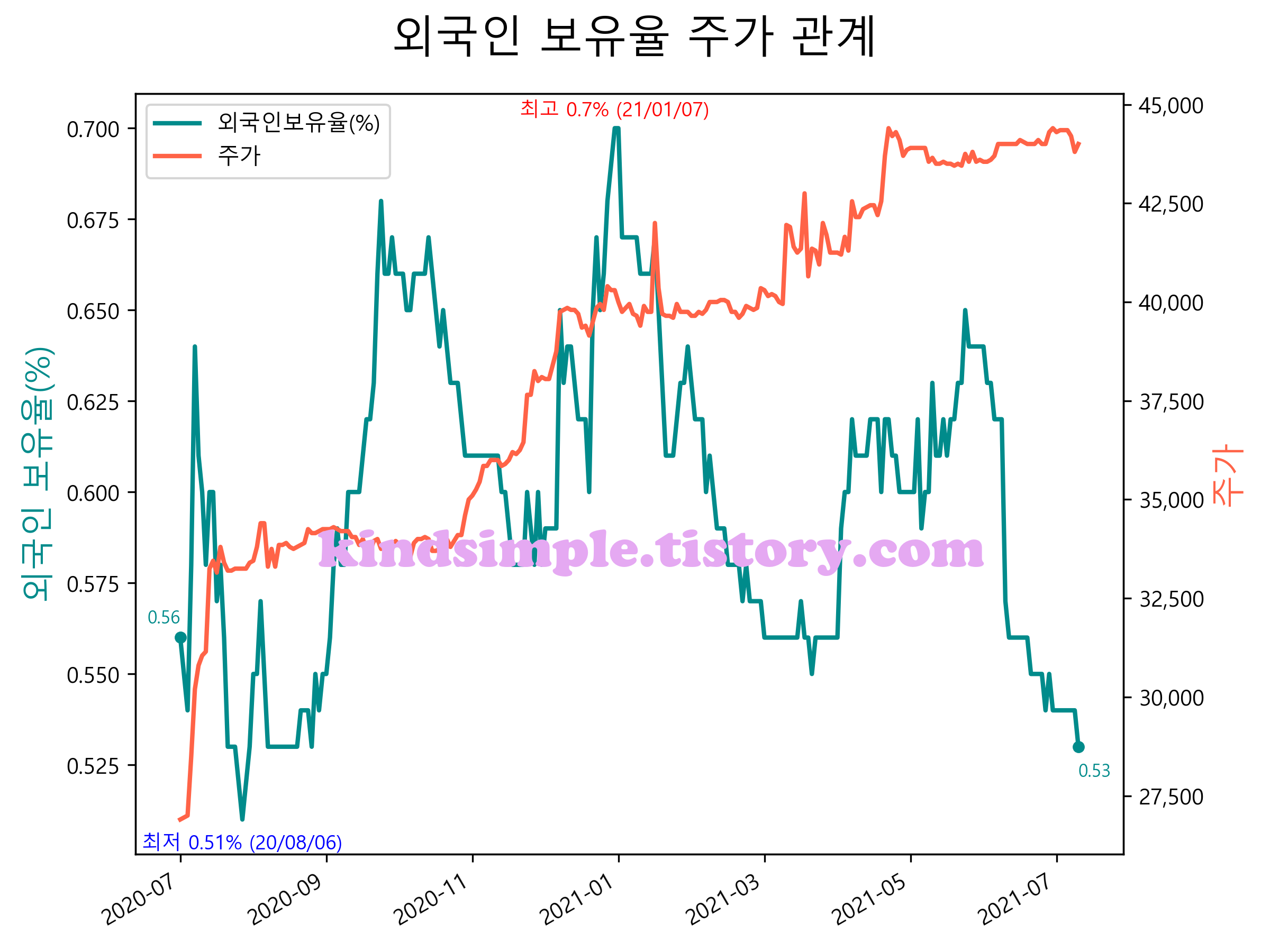 최근 1년간 외국인 보유율 및 주가와의 관계입니다.
