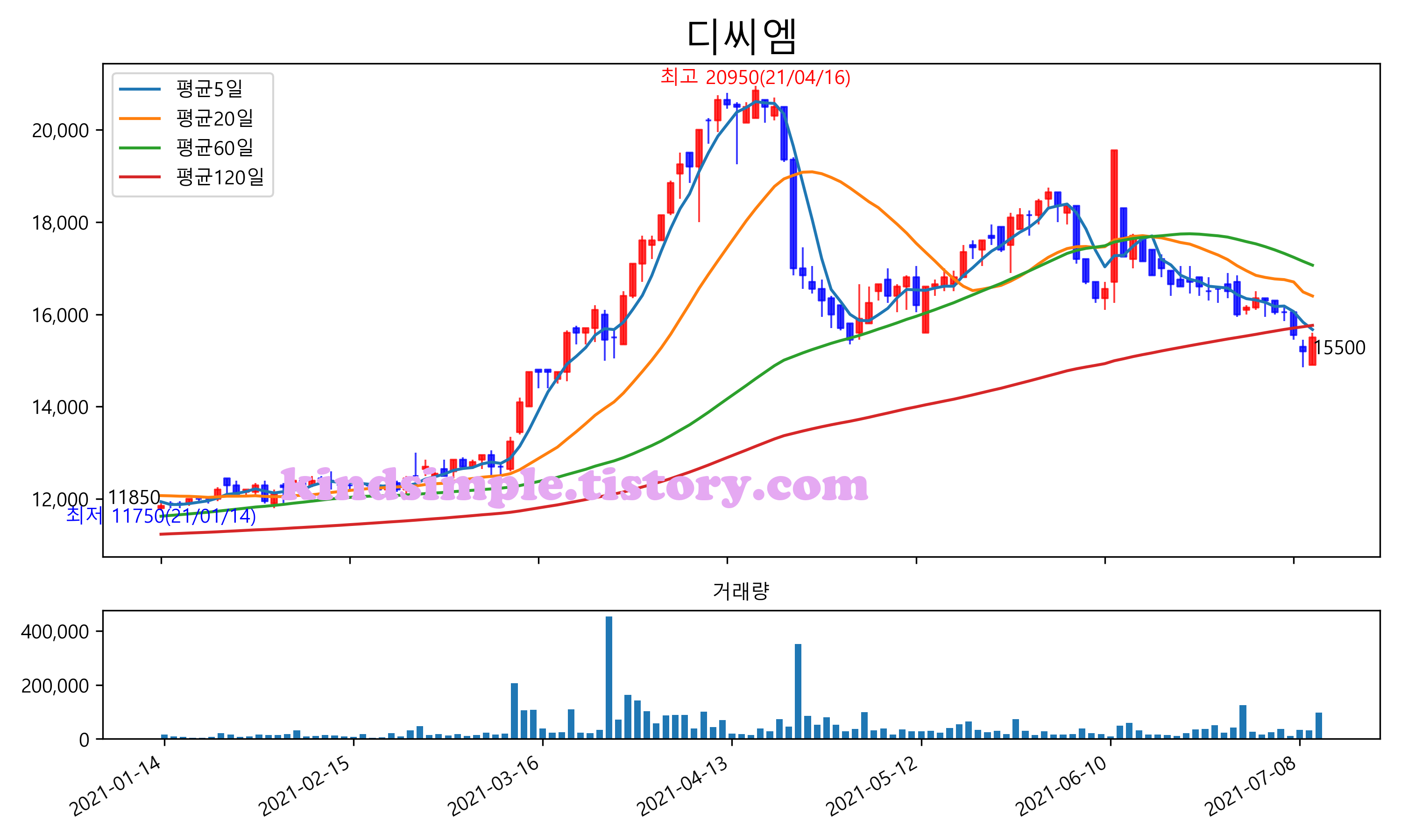 최근 6개월간 캔들차트 및 이동평균선입니다.