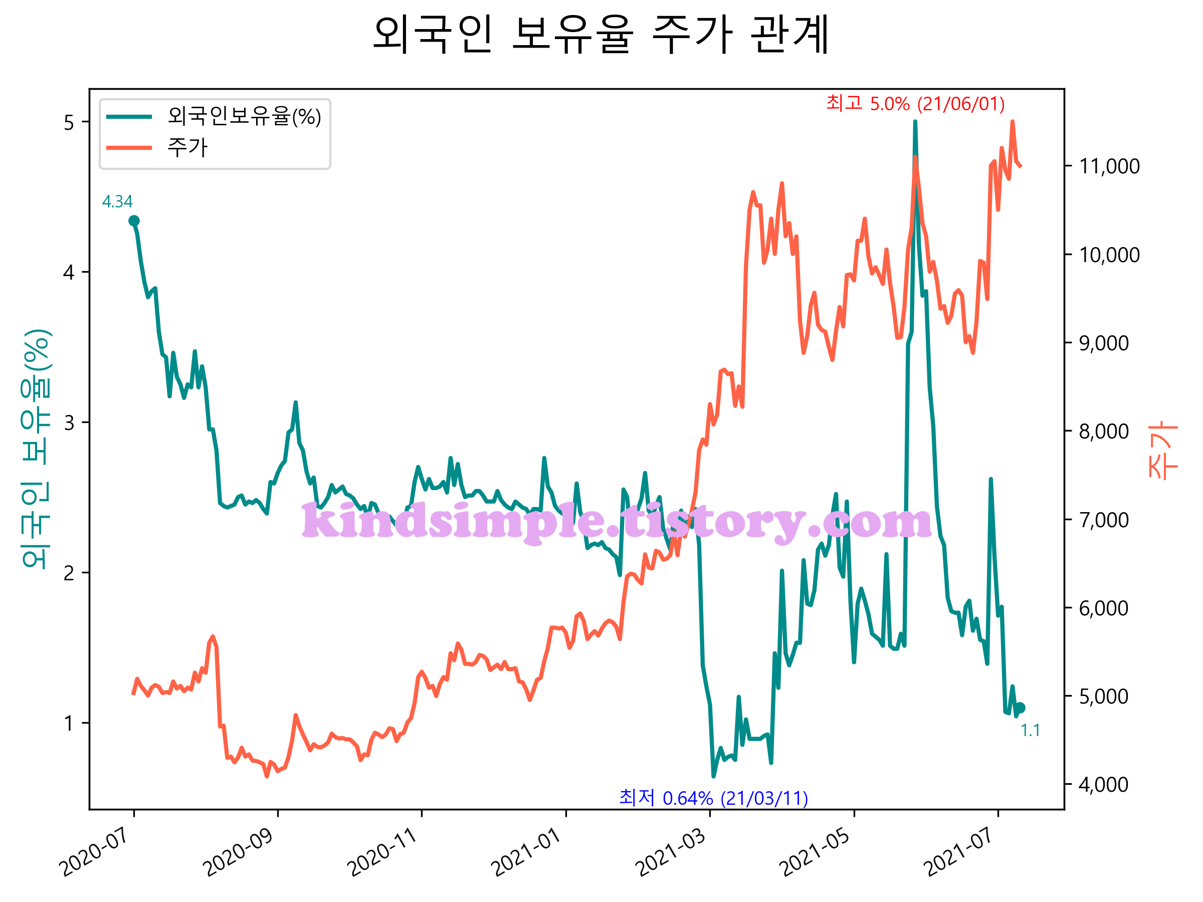 최근 1년간 외국인 보유율 및 주가와의 관계입니다.