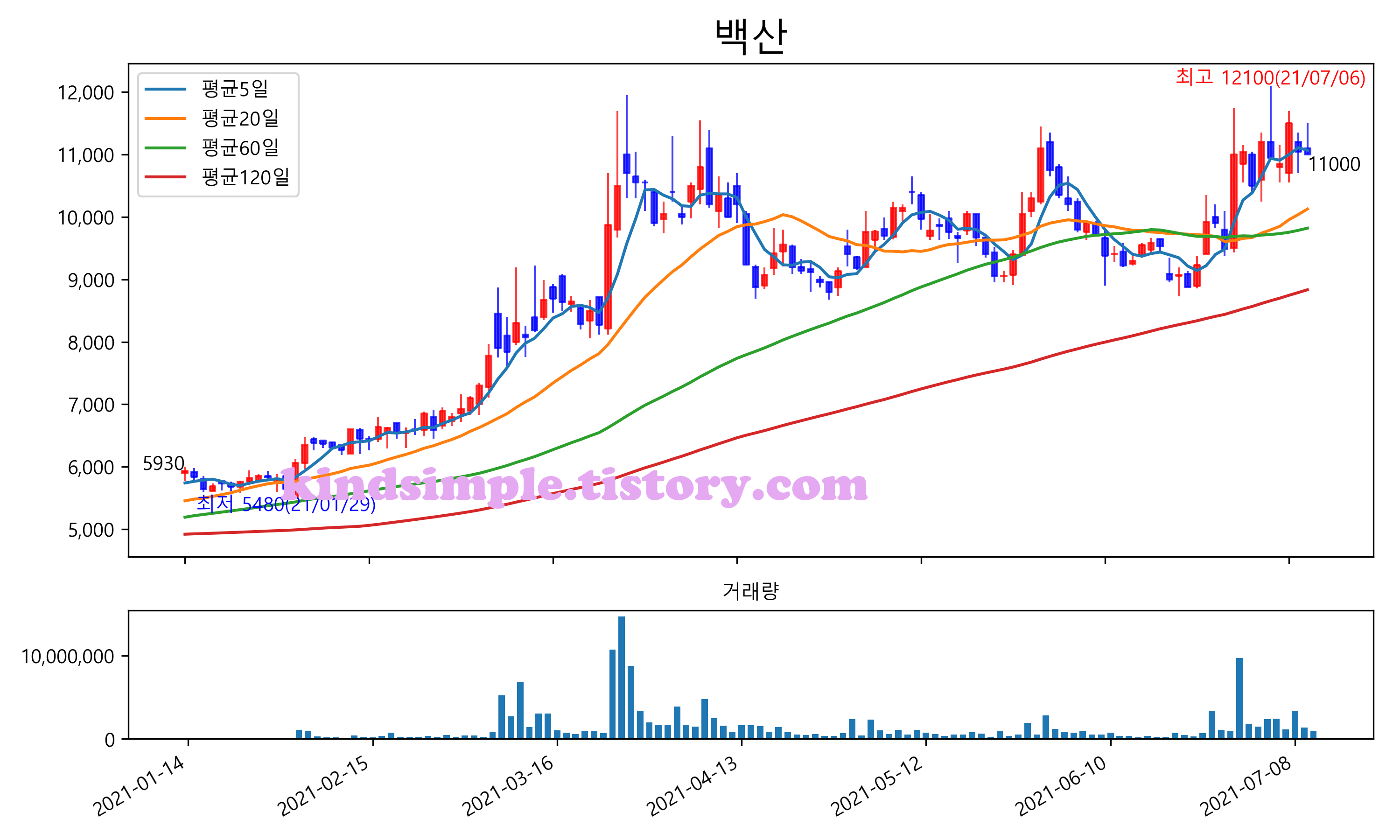 최근 6개월간 캔들차트 및 이동평균선입니다.
