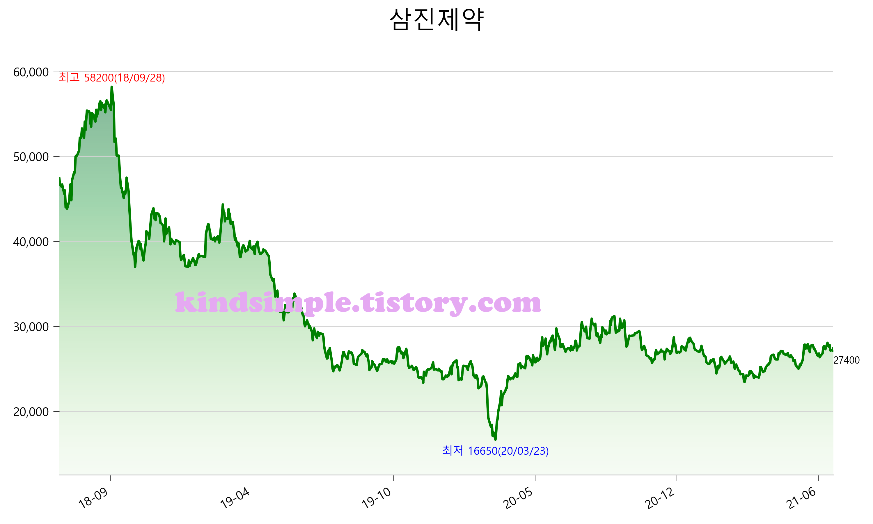 7월 13일 기준 주가는 27,400원 입니다. 아래는 최근 3년간의 주가흐름입니다.