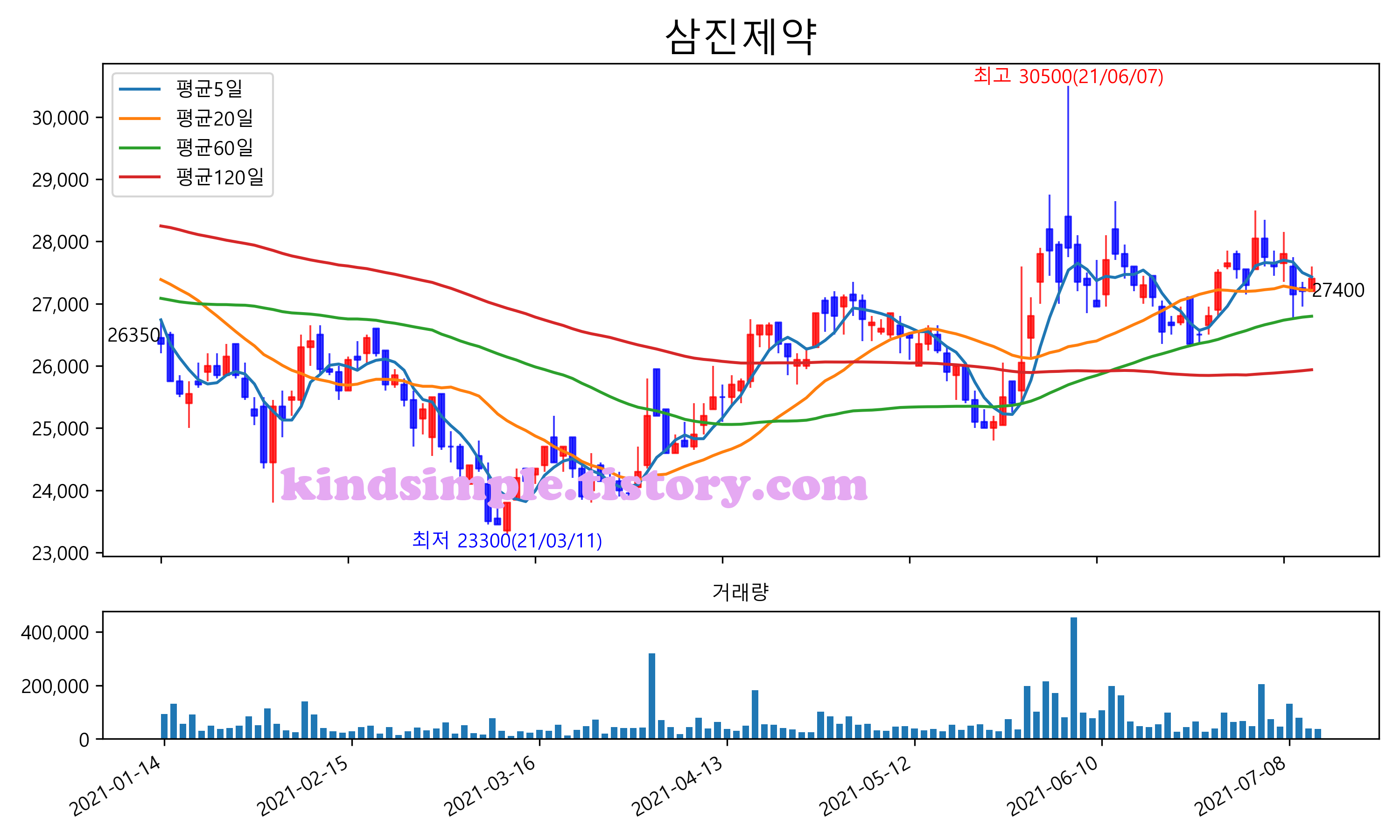 최근 6개월간 캔들차트 및 이동평균선입니다.