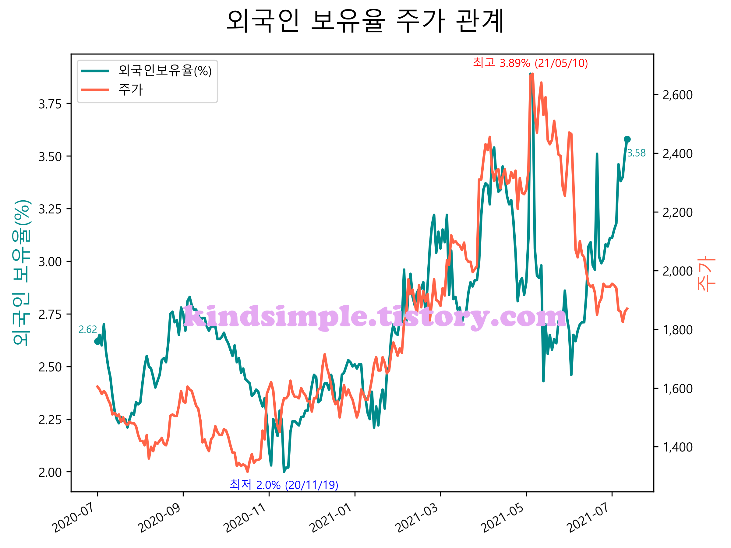 최근 1년간 외국인 보유율 및 주가와의 관계입니다.