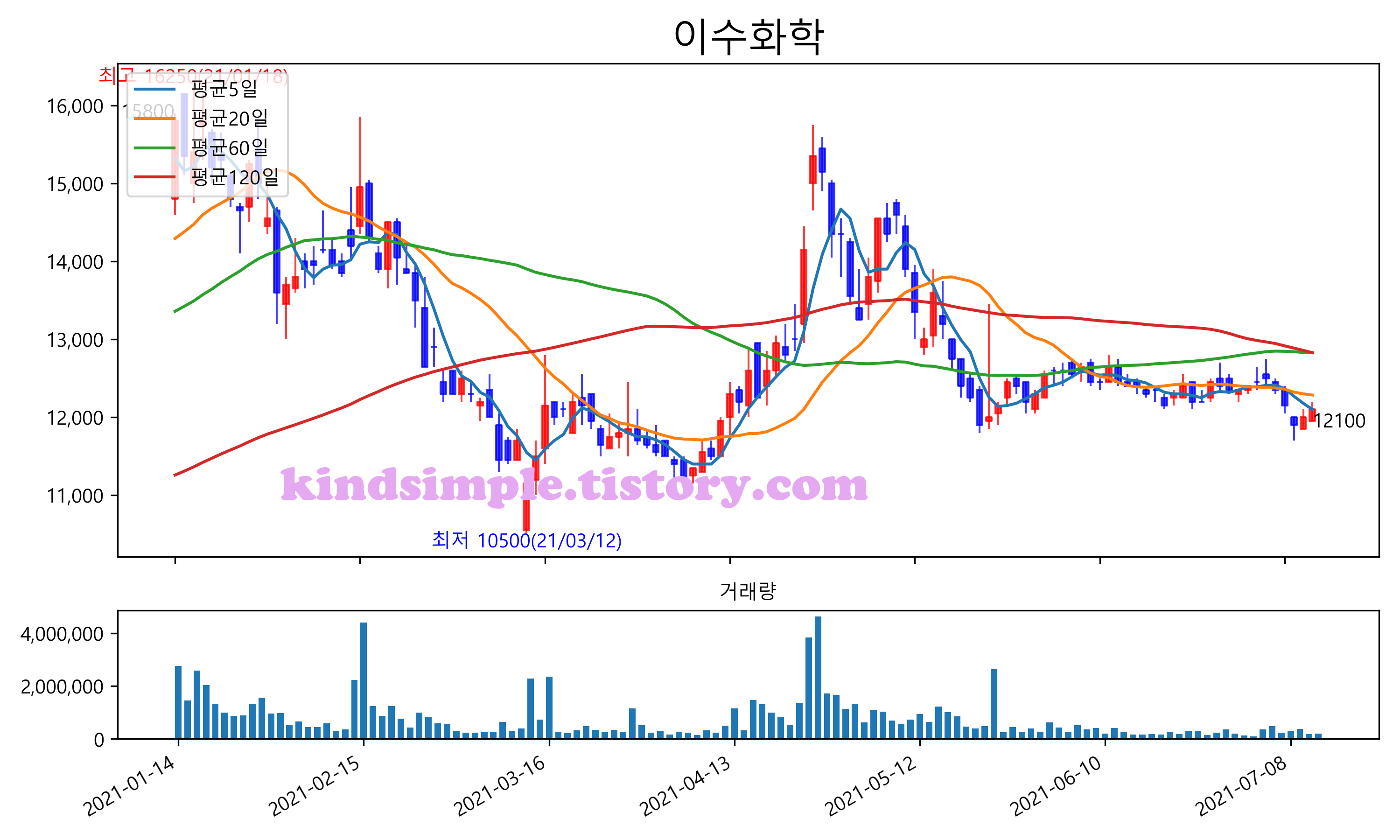 최근 6개월간 캔들차트 및 이동평균선입니다.