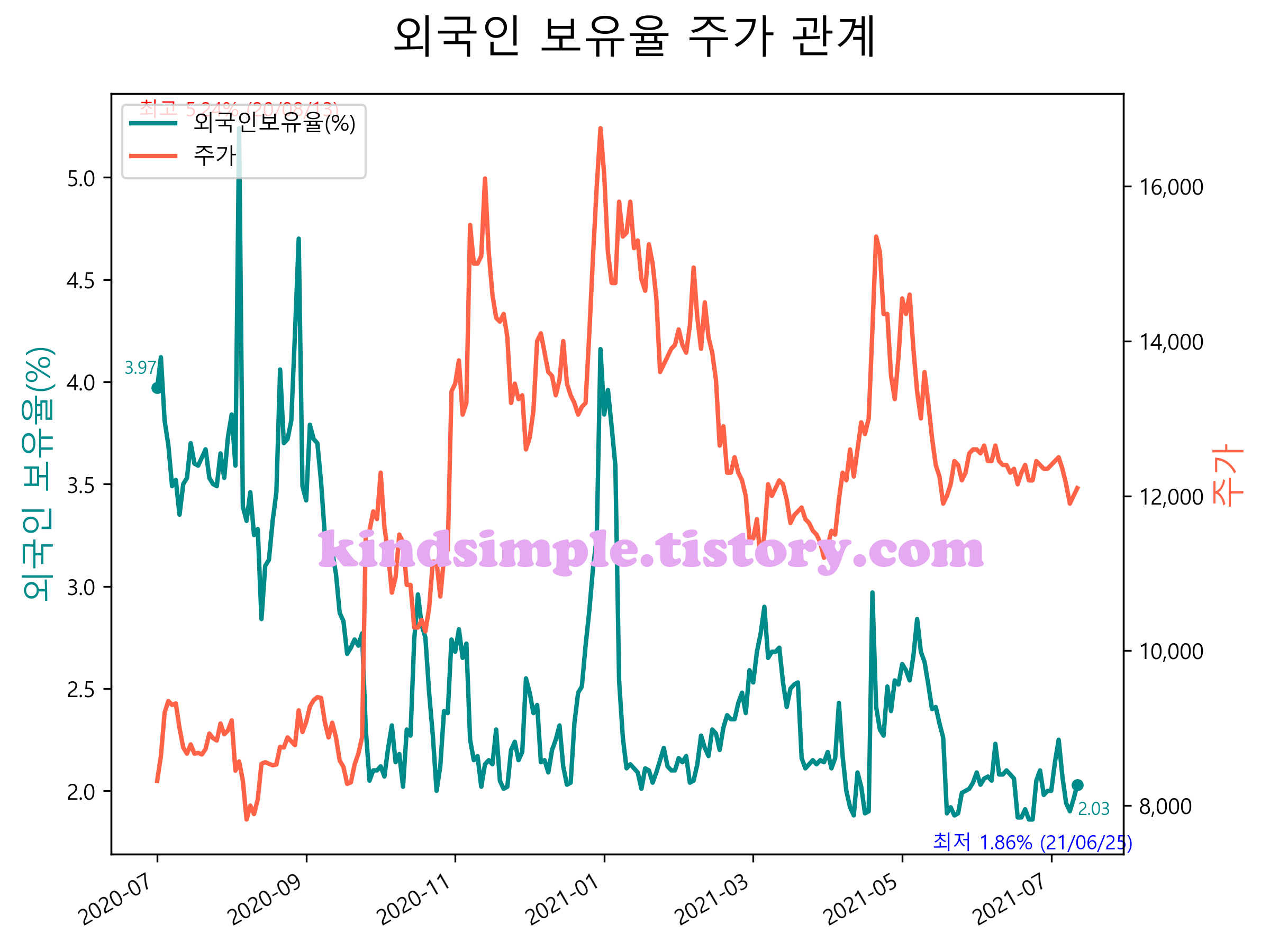 최근 1년간 외국인 보유율 및 주가와의 관계입니다.