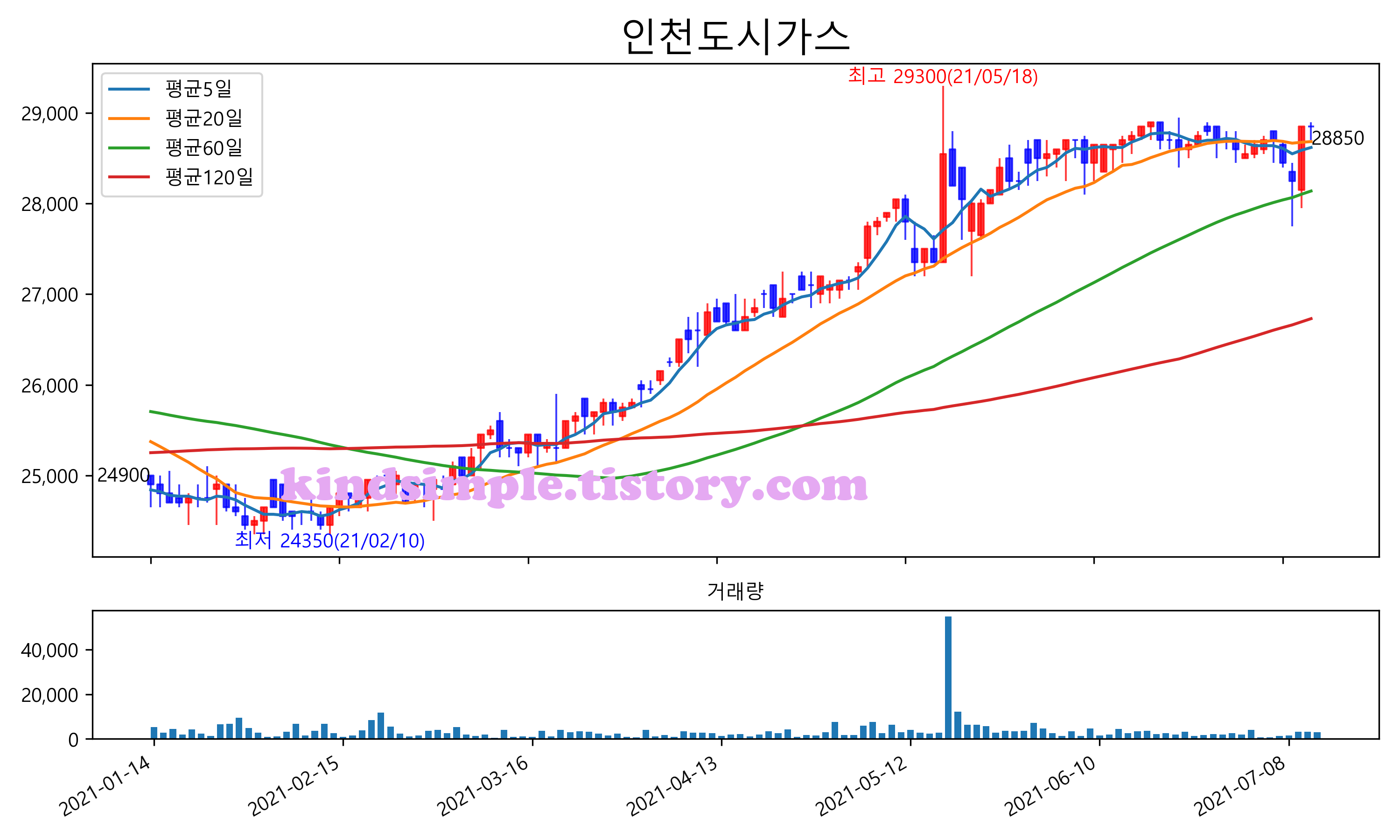 최근 6개월간 캔들차트 및 이동평균선입니다.