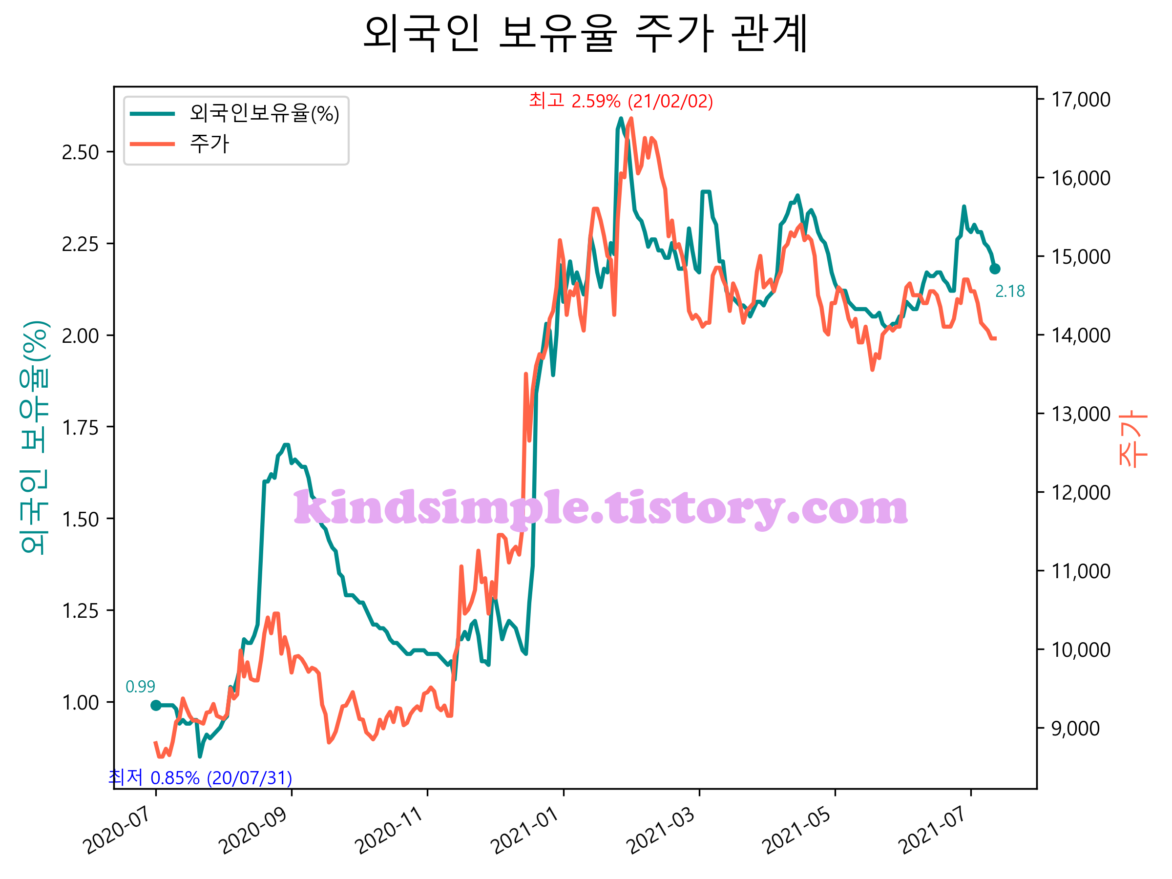 최근 1년간 외국인 보유율 및 주가와의 관계입니다.