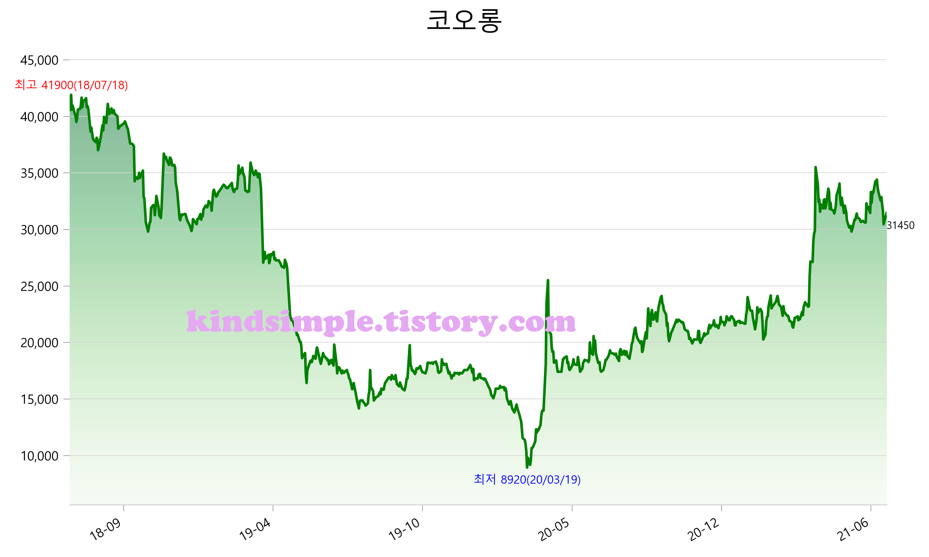 7월 13일 기준 주가는 31,450원 입니다. 아래는 최근 3년간의 주가흐름입니다.