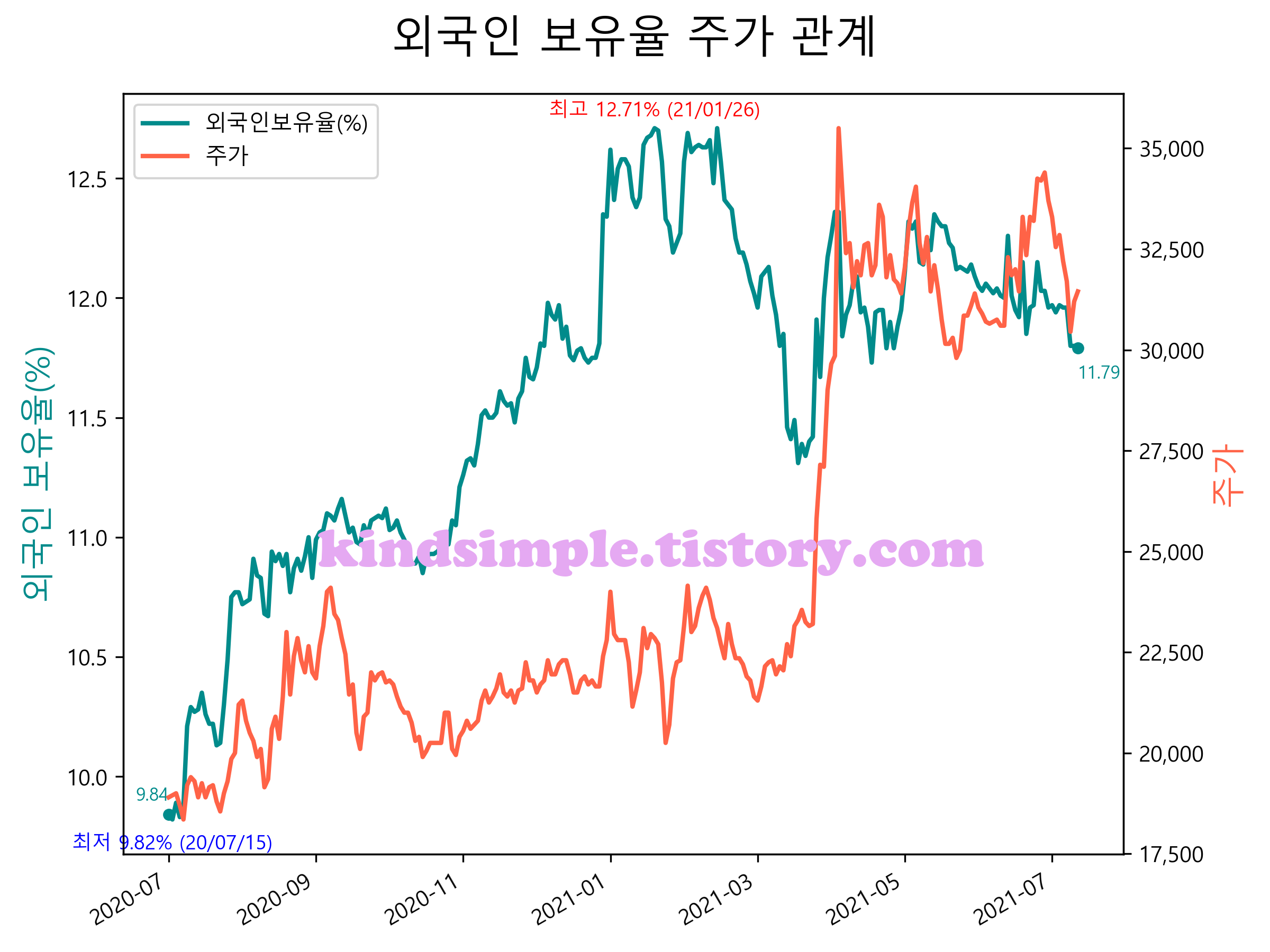 최근 1년간 외국인 보유율 및 주가와의 관계입니다.