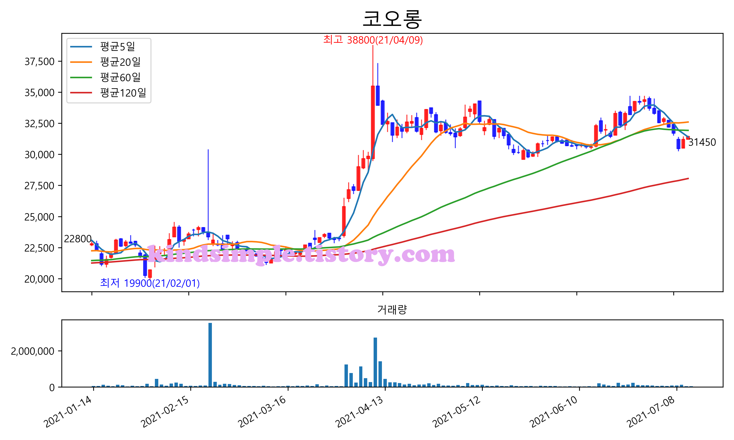 최근 6개월간 캔들차트 및 이동평균선입니다.