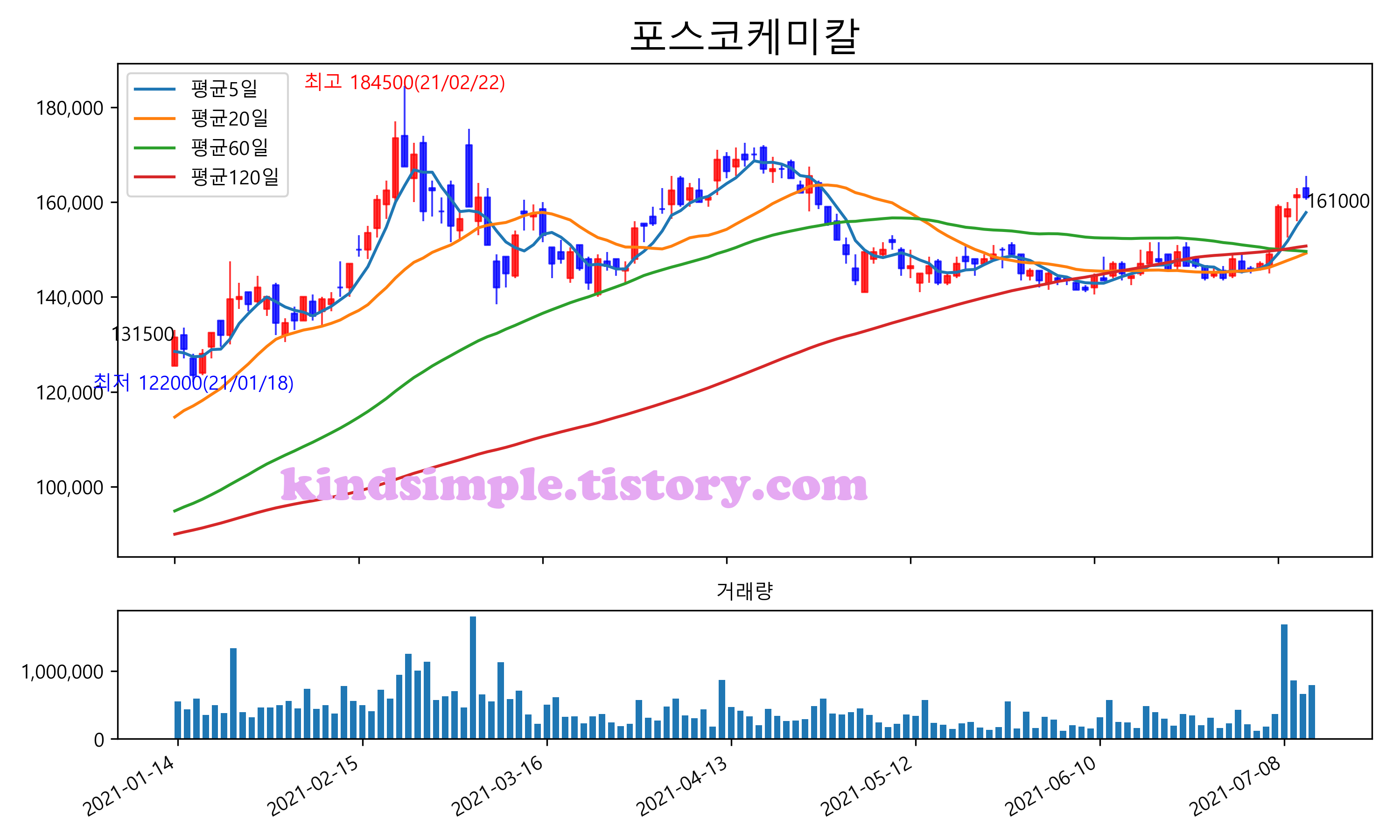 최근 6개월간 캔들차트 및 이동평균선입니다.