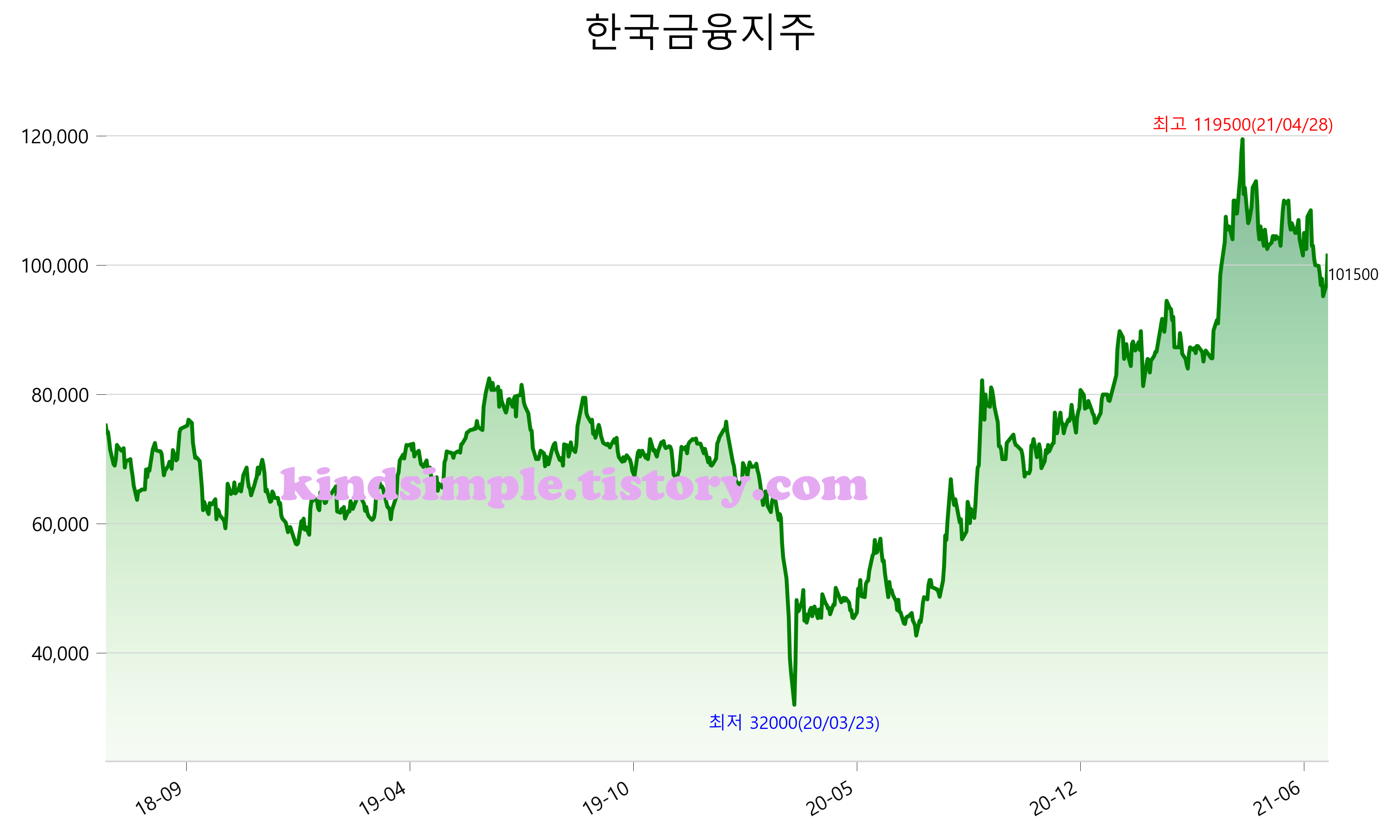 7월 13일 기준 주가는 101,500원 입니다. 아래는 최근 3년간의 주가흐름입니다.