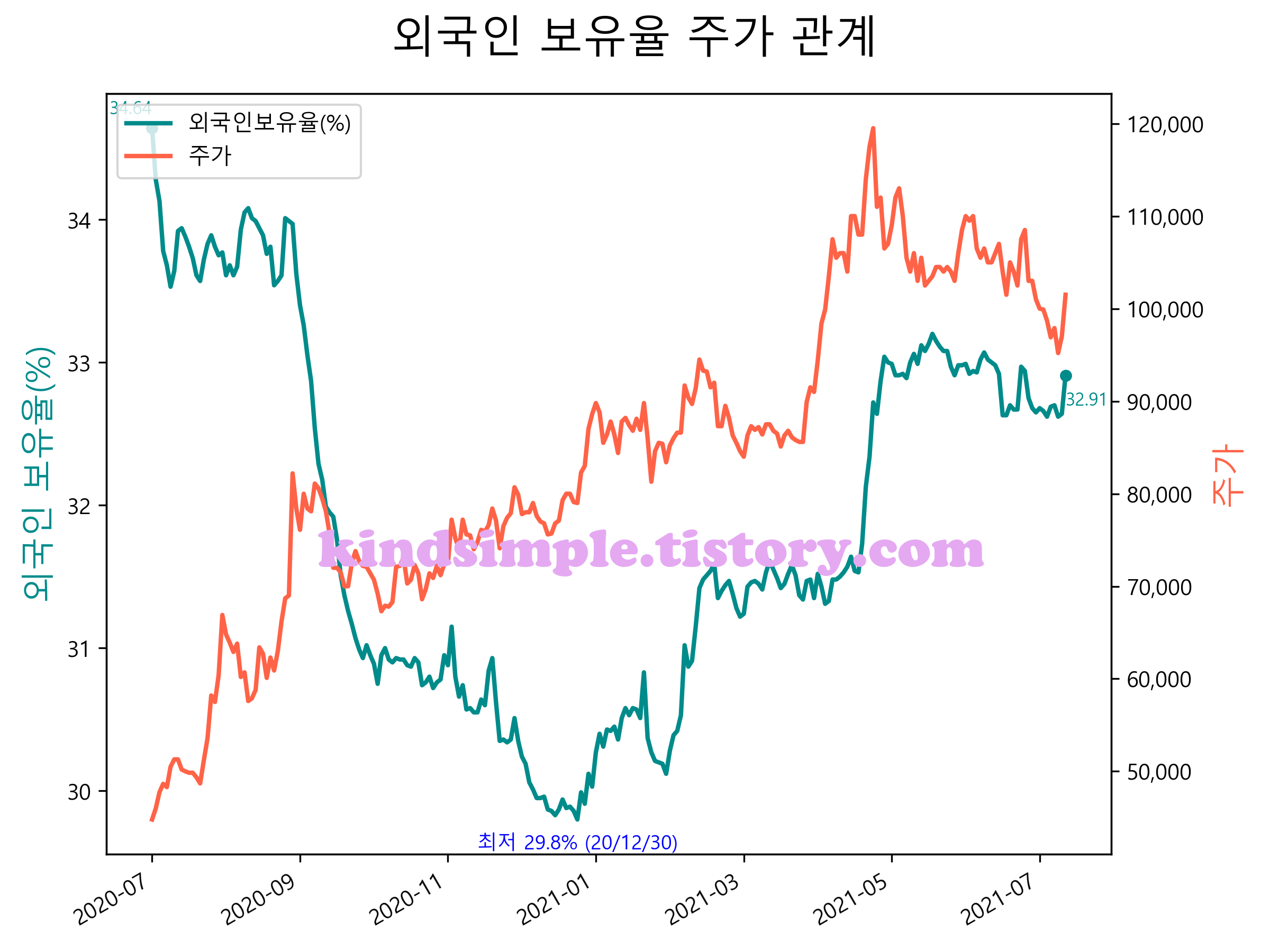 최근 1년간 외국인 보유율 및 주가와의 관계입니다.