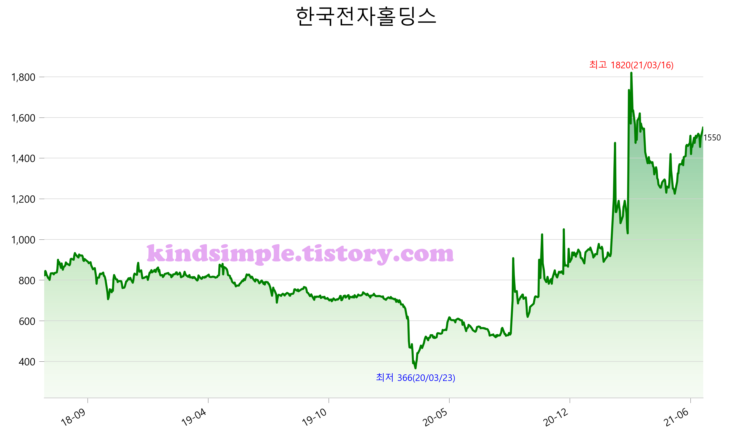 - 1979년 11월 30일 주식을 한국거래소에 상장했으며 2010년3월 26일자로 상호를 ㈜케이이씨홀딩스에서 ㈜한국전자홀딩스로 변경함.