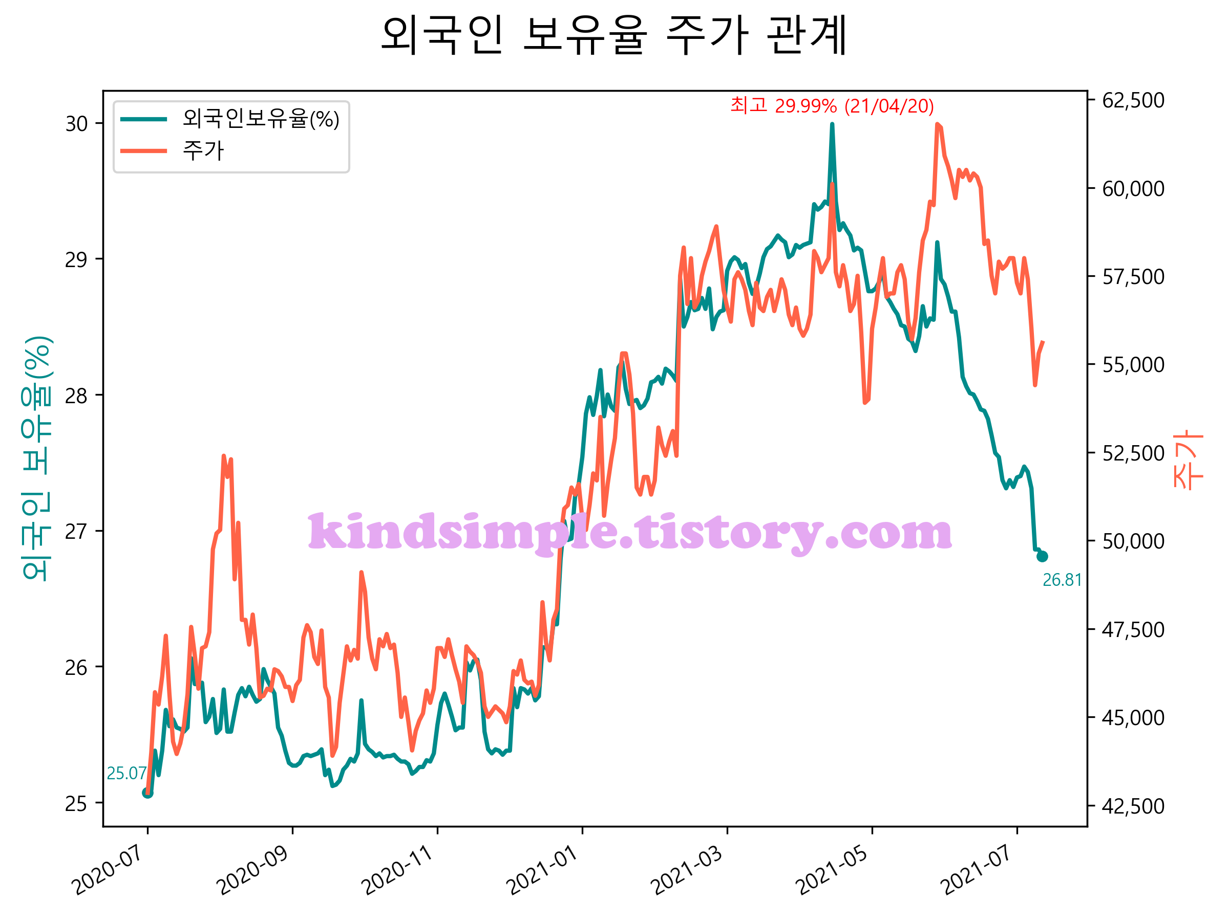 최근 1년간 외국인 보유율 및 주가와의 관계입니다.