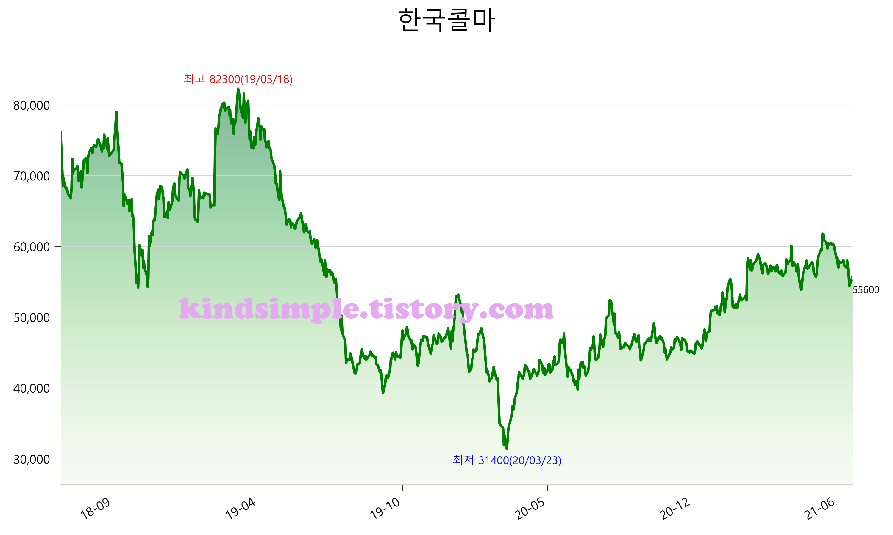 7월 13일 기준 주가는 55,600원 입니다. 아래는 최근 3년간의 주가흐름입니다.