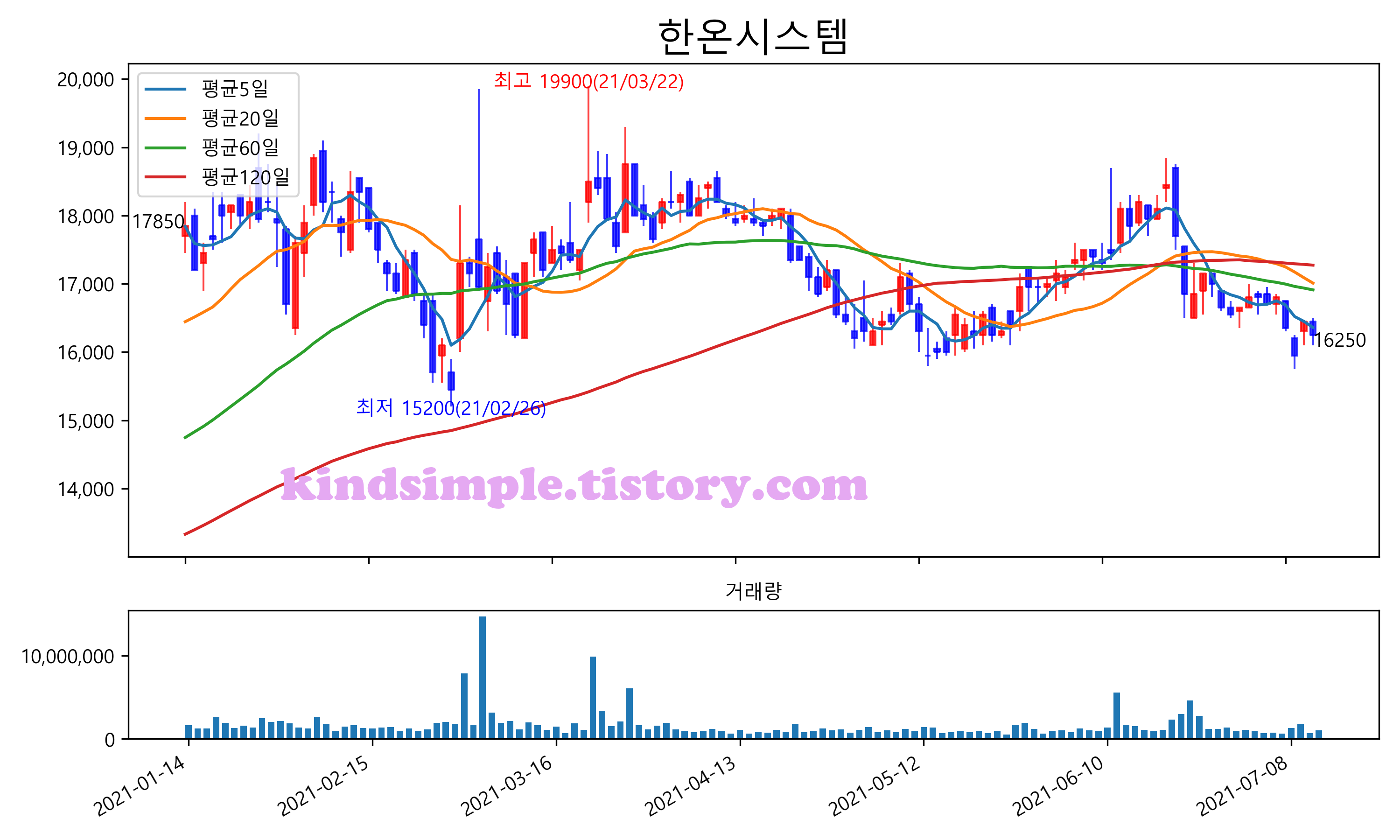 최근 6개월간 캔들차트 및 이동평균선입니다.
