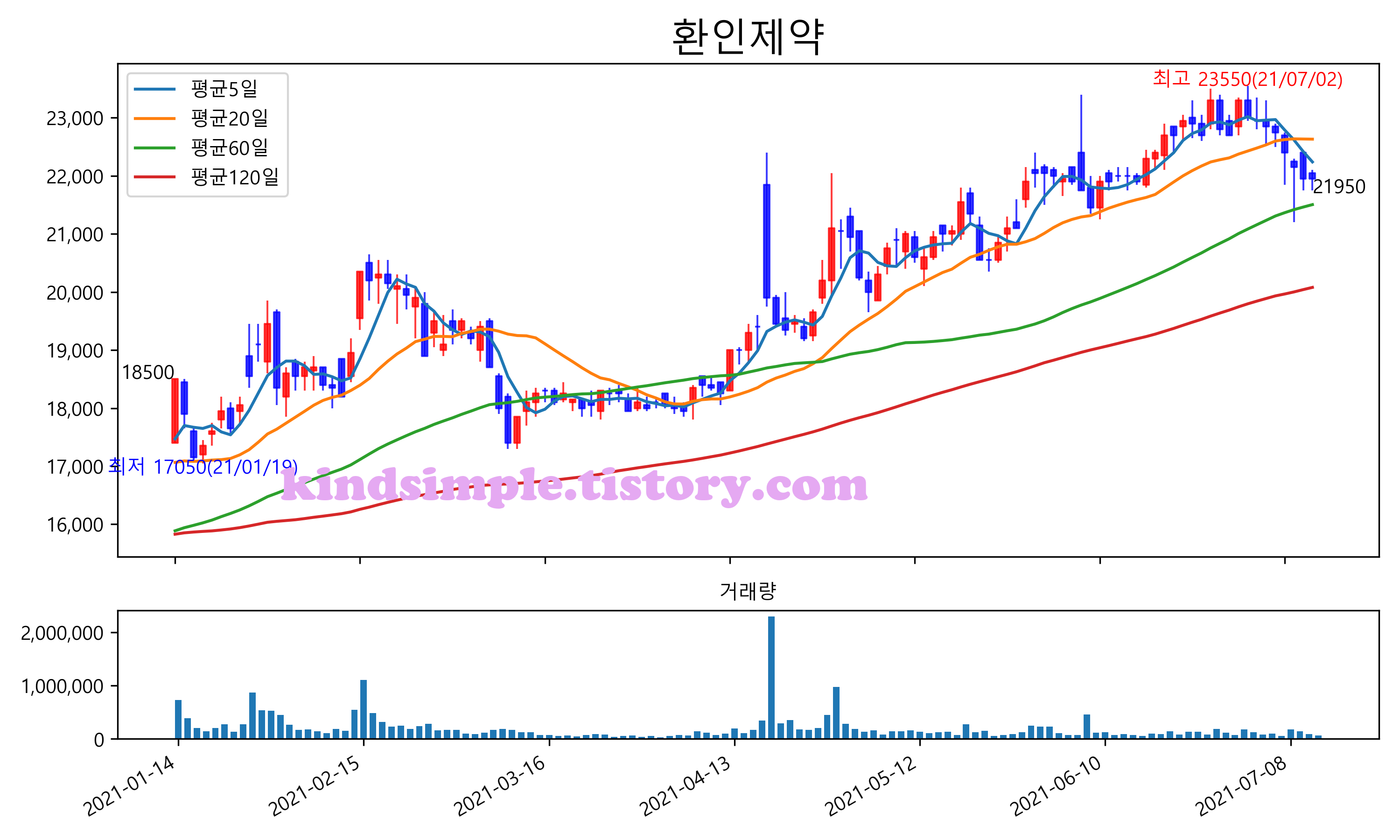 최근 6개월간 캔들차트 및 이동평균선입니다.