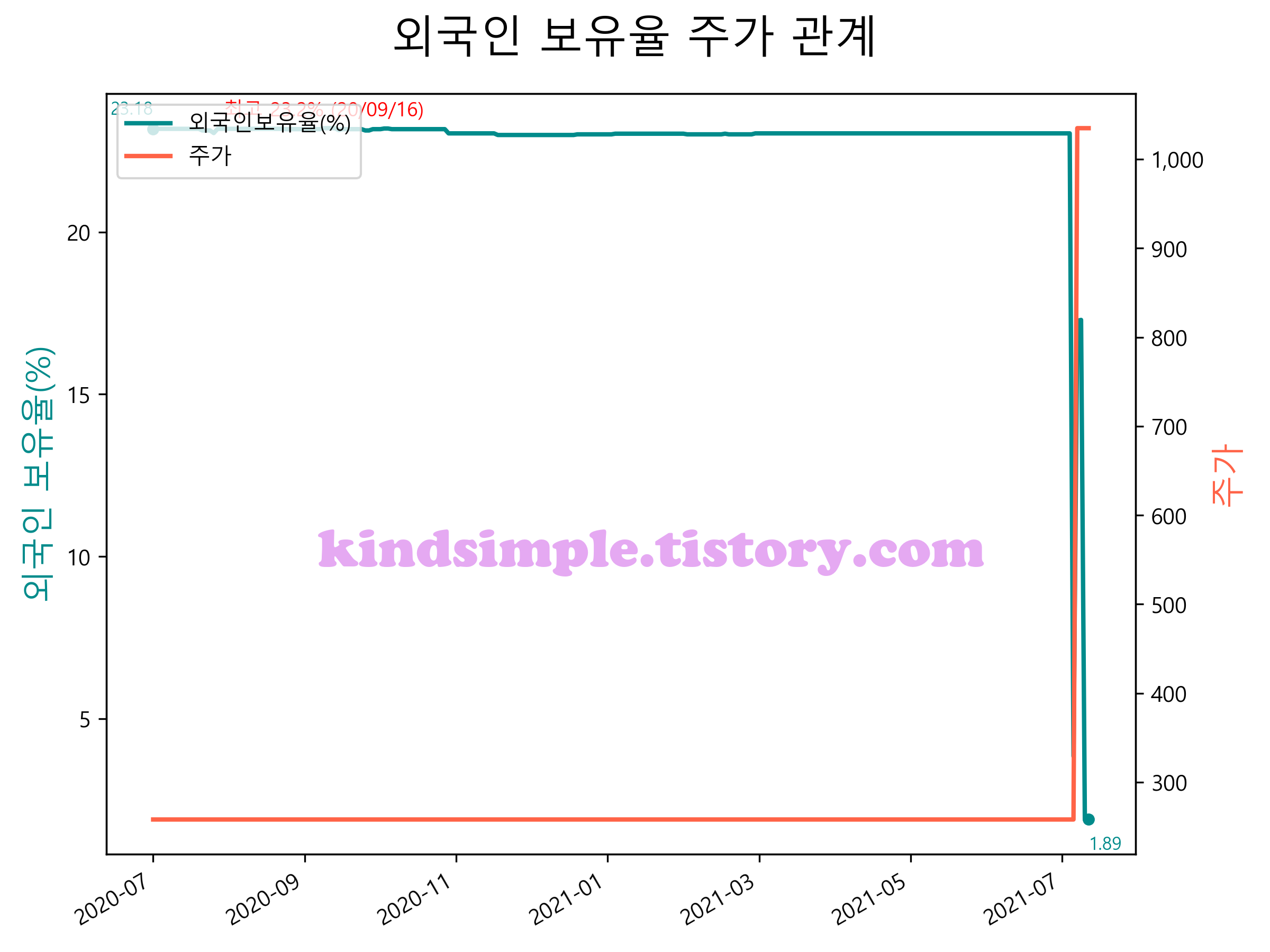 최근 1년간 외국인 보유율 및 주가와의 관계입니다.