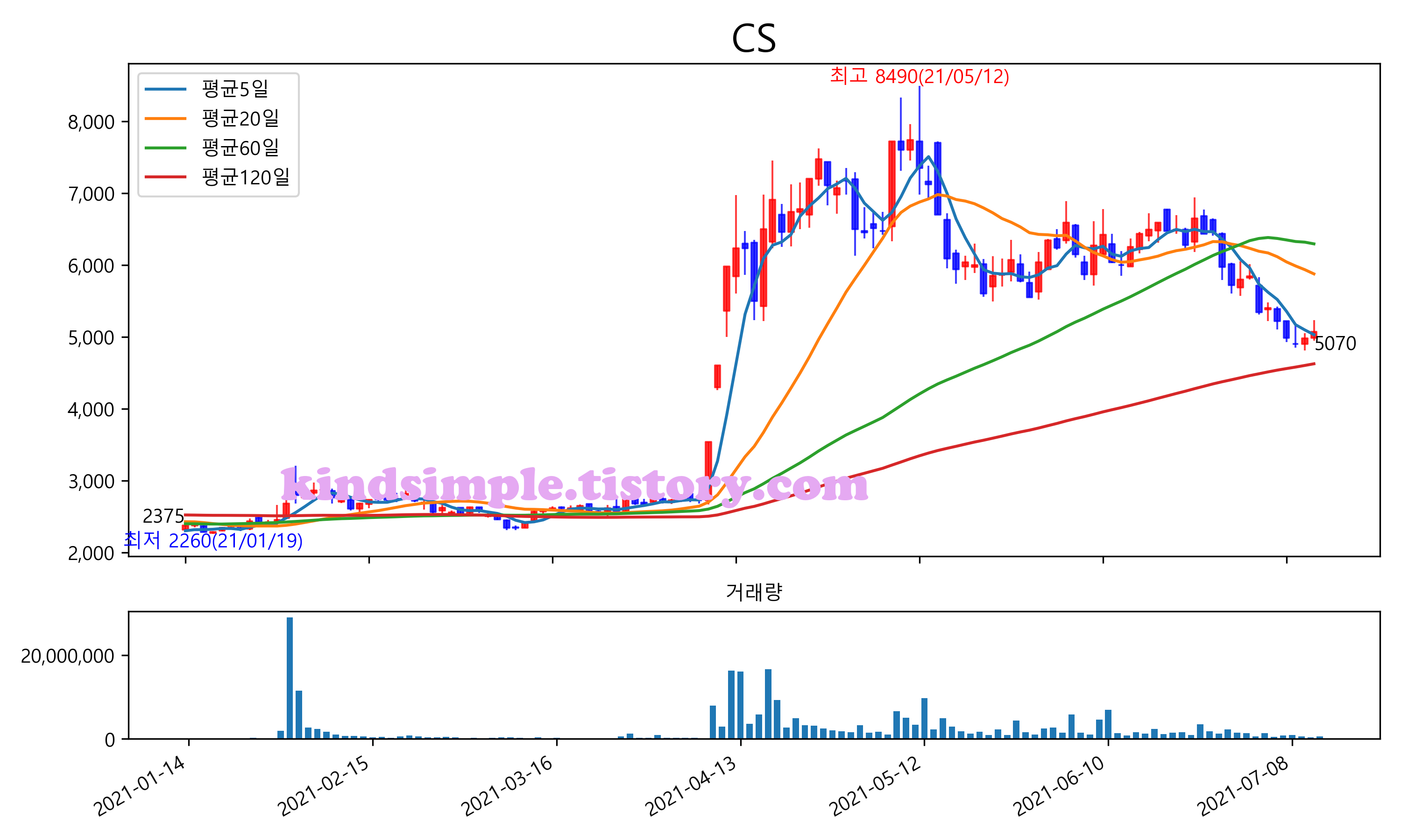 최근 6개월간 캔들차트 및 이동평균선입니다.