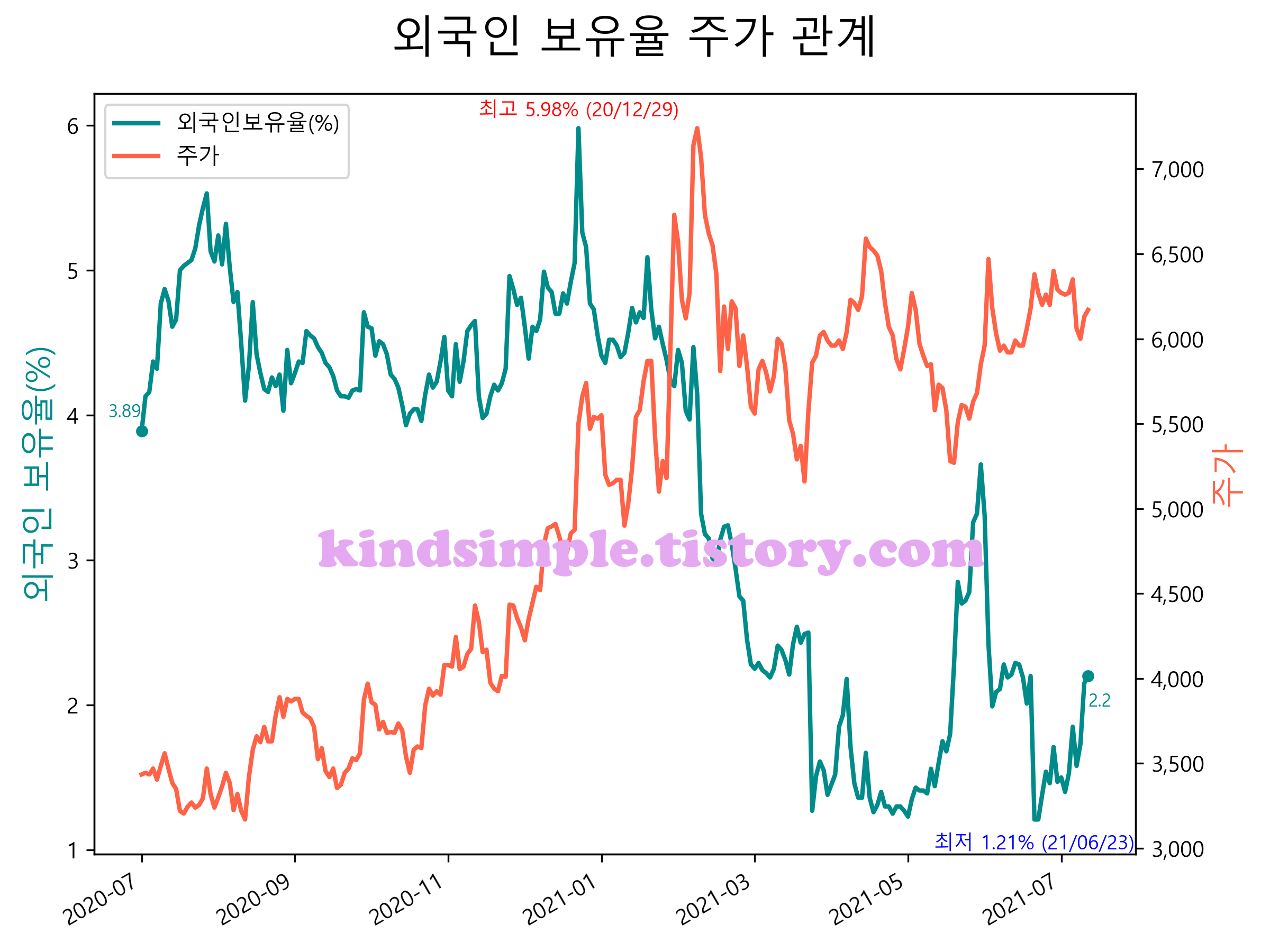 최근 1년간 외국인 보유율 및 주가와의 관계입니다.