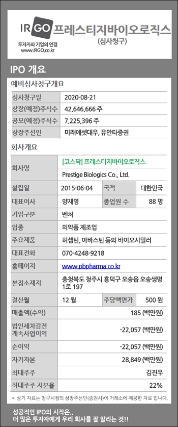 참고로 관계사인 프레스티지바이오파마는 '피비파마'라는 종목으로 2월 5일 상장했는데, 공모가는 32000원이었으며, 상장시초가는 28800원으로 공모가를 하회했습니다. 하지만 2월 15일에는 한때 54,000원까지 상승하였으며 2월 26일 종가는 38800원입니다.