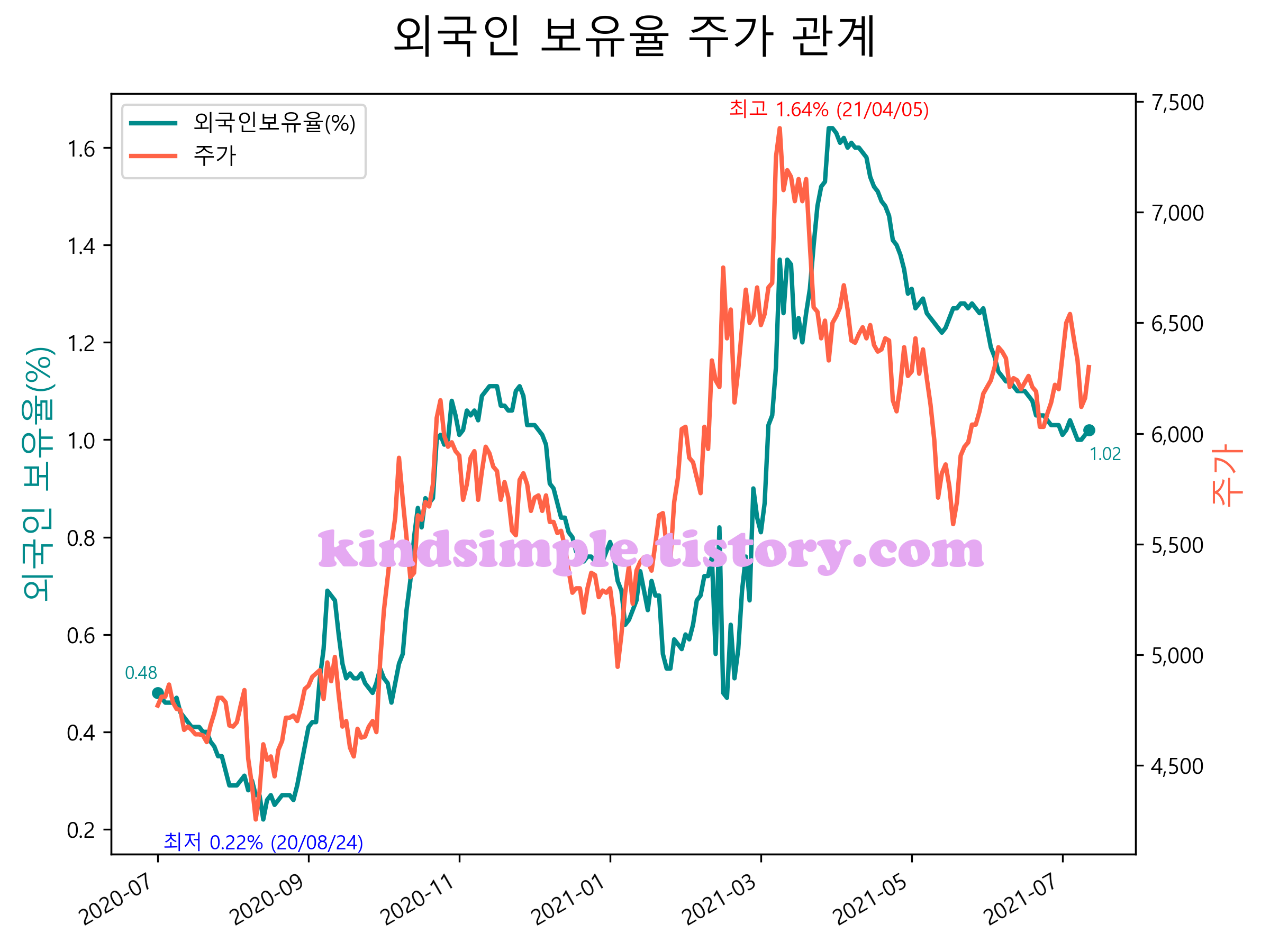 최근 1년간 외국인 보유율 및 주가와의 관계입니다.