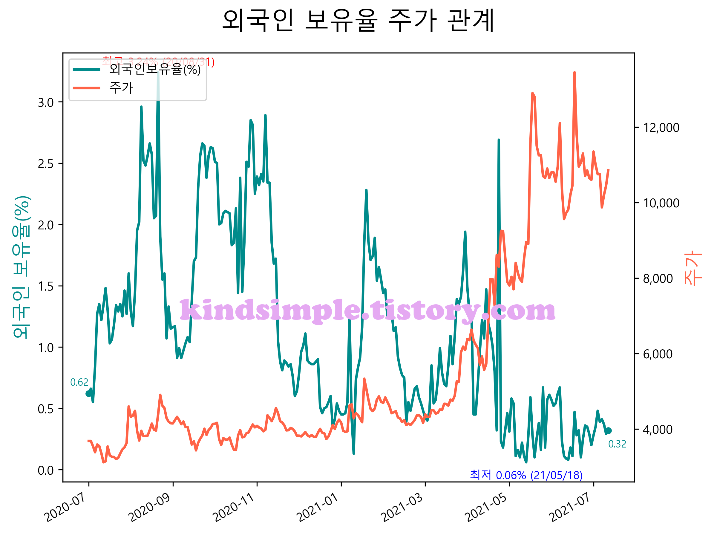 최근 1년간 외국인 보유율 및 주가와의 관계입니다.