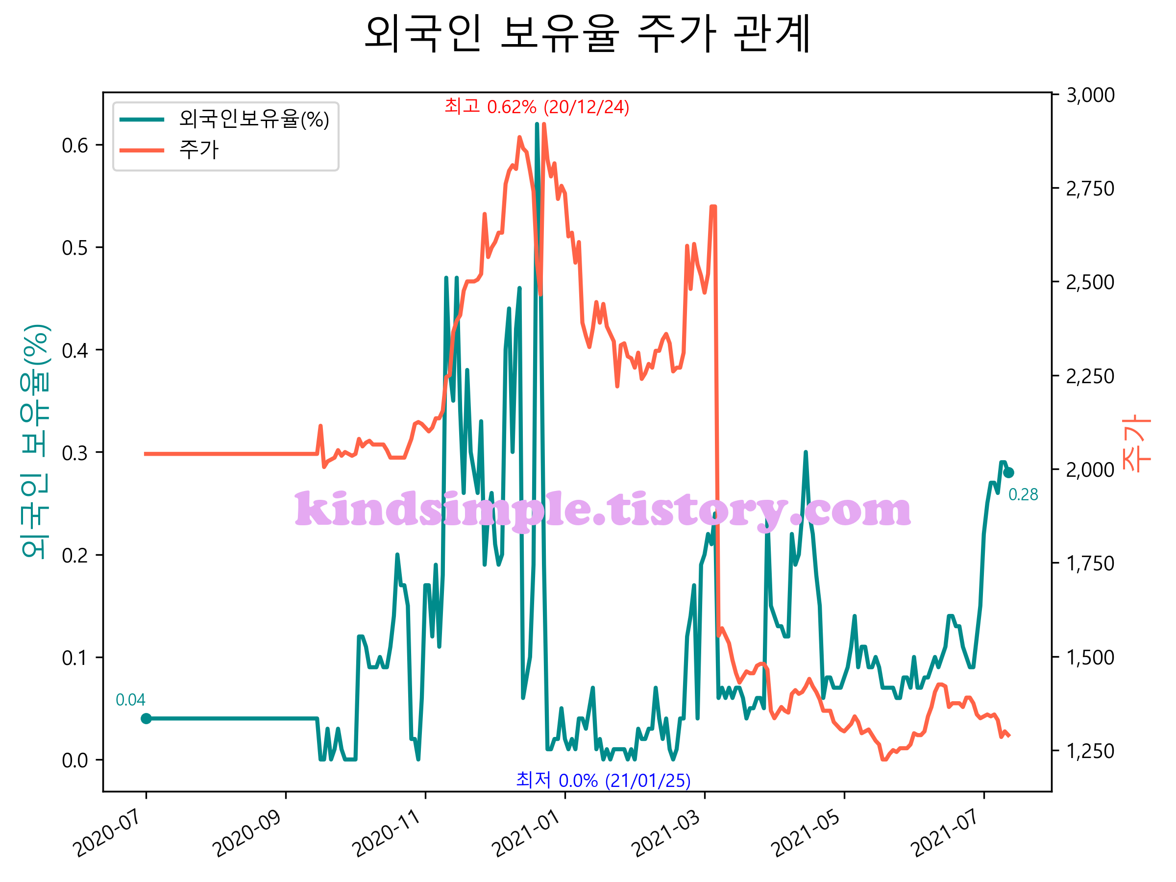 최근 1년간 외국인 보유율 및 주가와의 관계입니다.