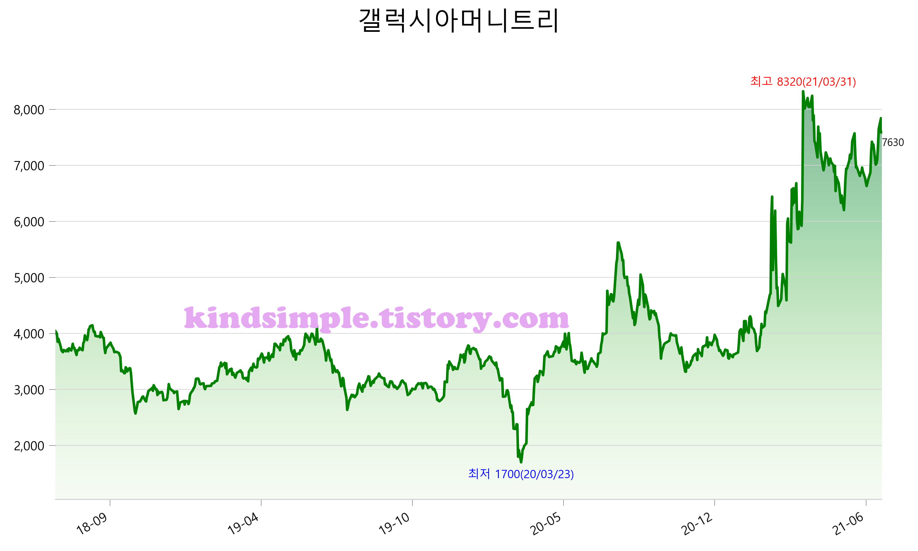 7월 14일 기준 주가는 7,630원 입니다. 아래는 최근 3년간의 주가흐름입니다.
