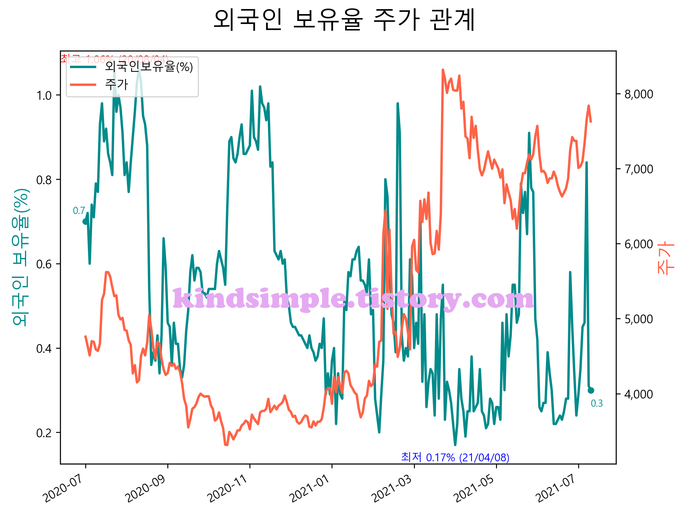 최근 1년간 외국인 보유율 및 주가와의 관계입니다.