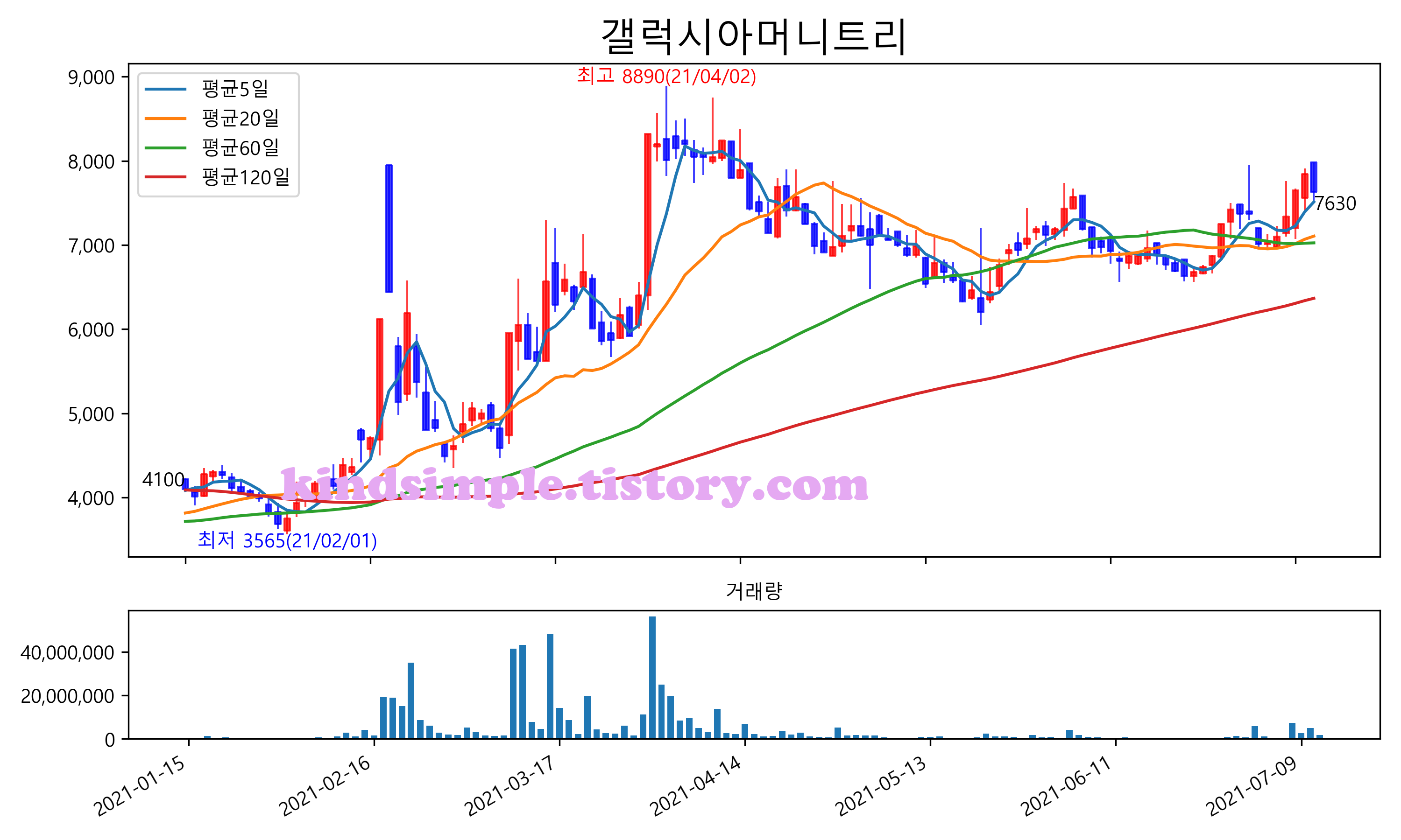 최근 6개월간 캔들차트 및 이동평균선입니다.