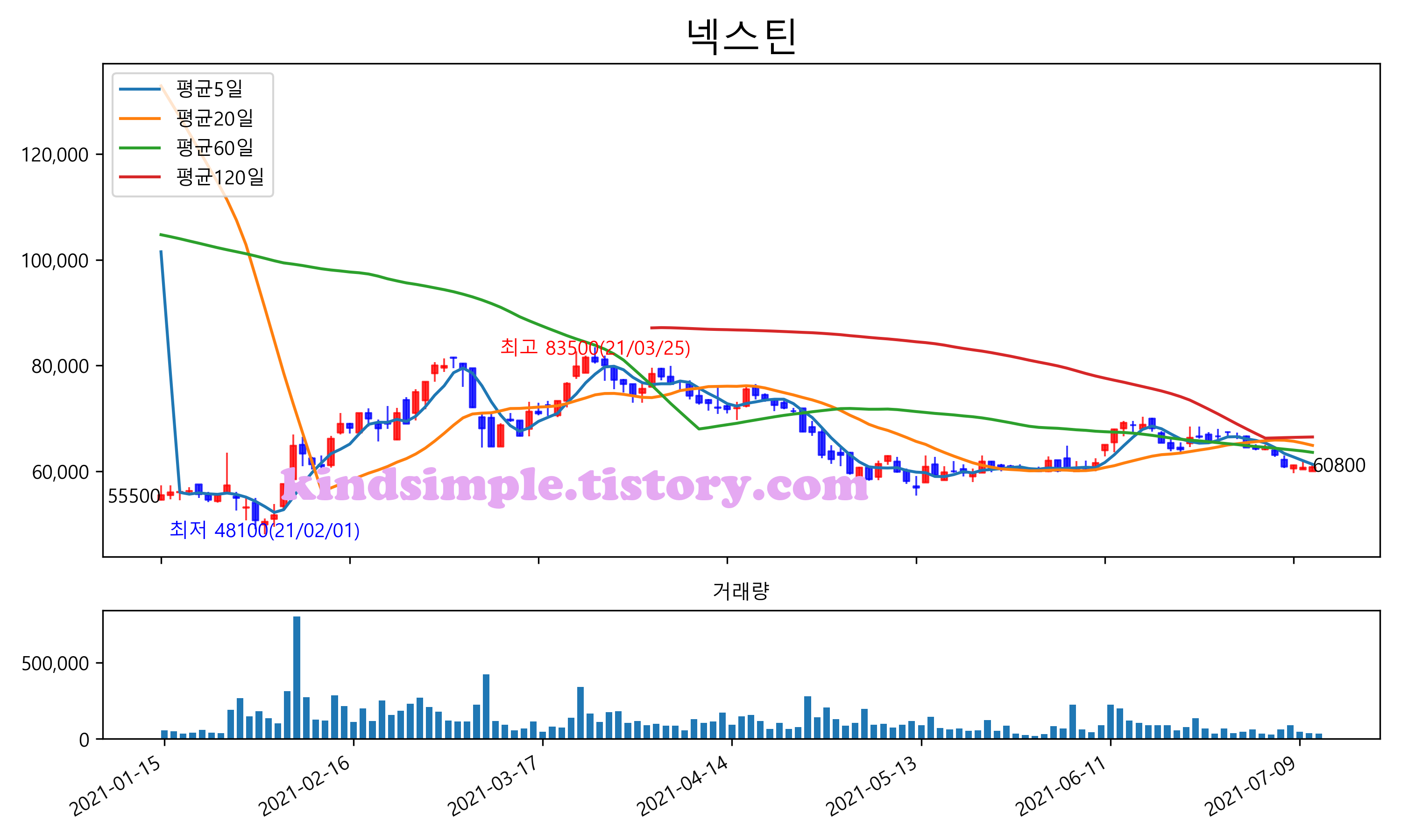 최근 6개월간 캔들차트 및 이동평균선입니다.