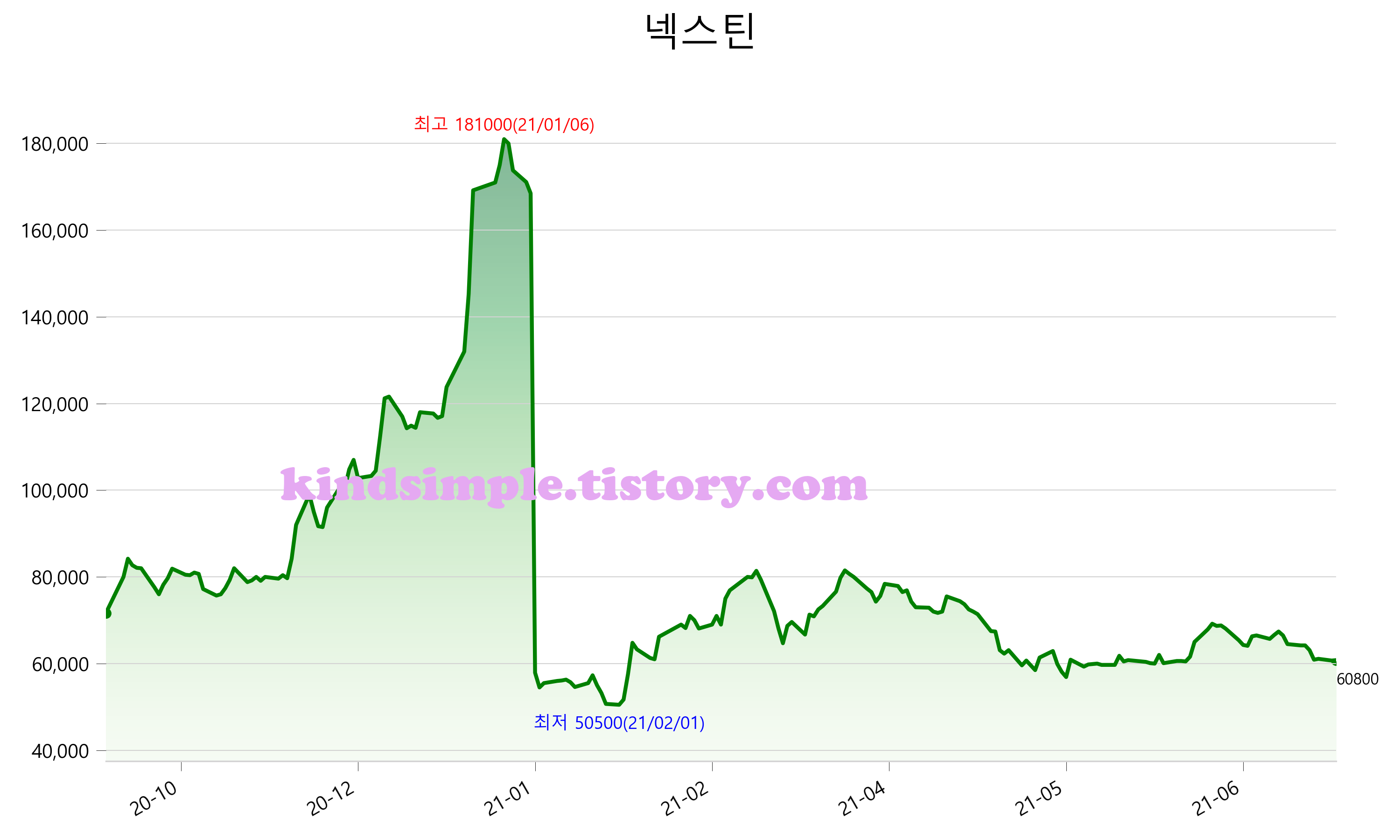 52주 최고가는 181,000원(2021-01-06), 52주 최저가는 50,500원(2021-02-01)으로 52주간 변동률은 -15.1% 입니다.