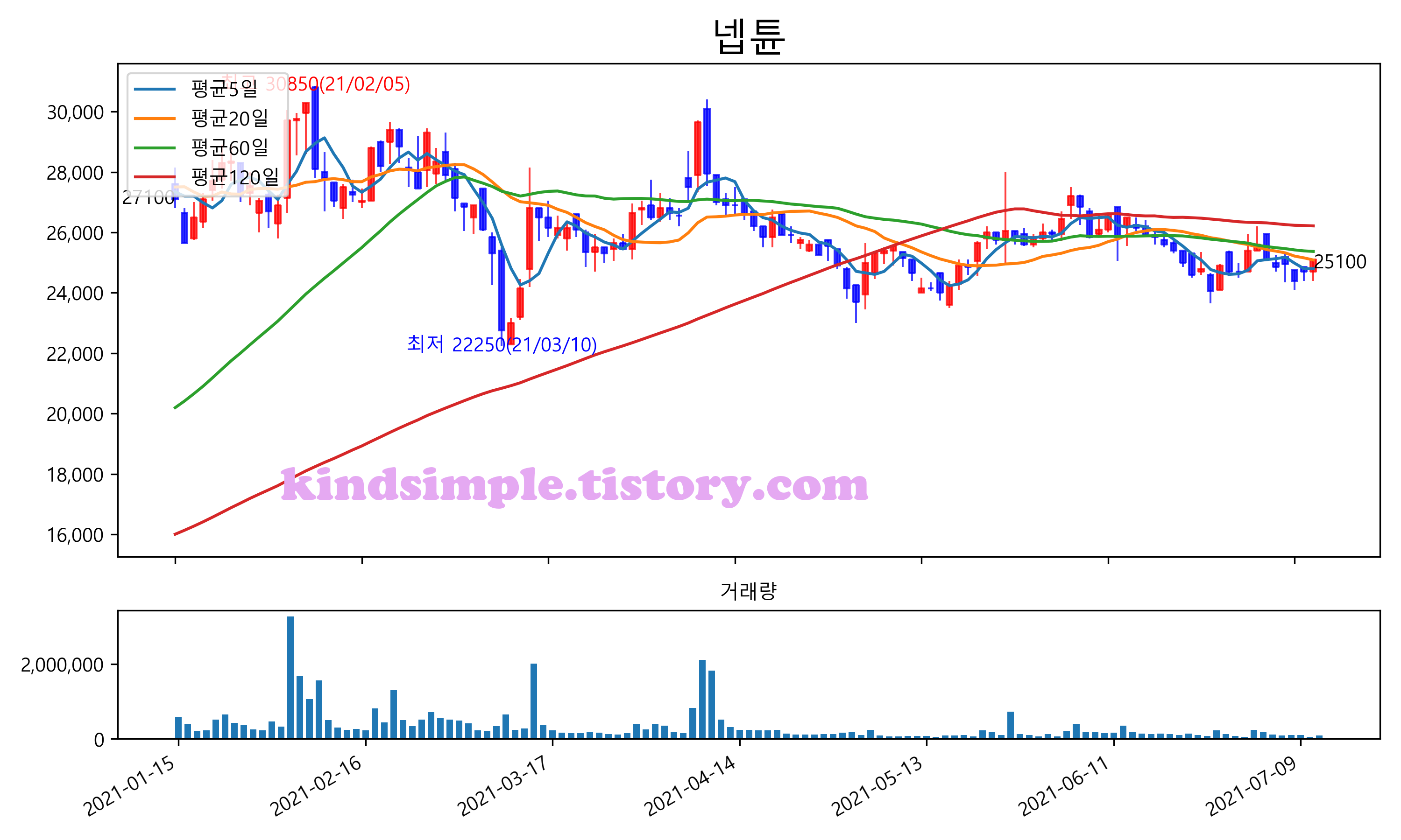 최근 6개월간 캔들차트 및 이동평균선입니다.