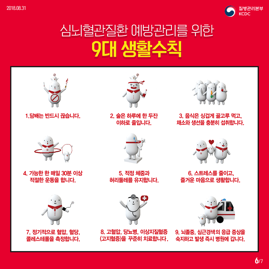 평소에 고지혈증, 고혈압 등이 있는 경우 반드시 식습관 및 적당한 운동으로 건강하게 심장을 관리해야 합니다. 일주일에 5회 이상 30분씩 운동하고, 채소 중심의 식습관을 들이는 것이 좋습니다. 지나친 음주나 흡연은 심근경색의 원인일 수 있으니 줄이거나 끊는다면 예방에 도움이 됩니다.