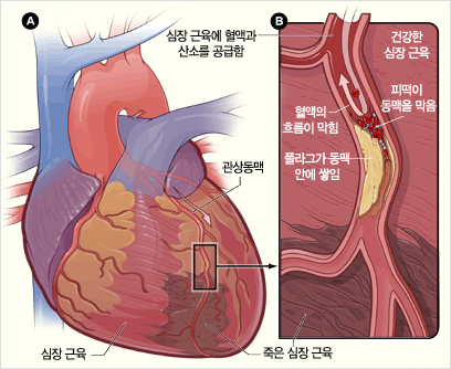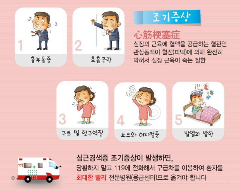 심근경색은 초기 사망률이 30%에 달할 정도로 생명과 직결되는 질환입니다. 딱히 전조증상없이 바로 발병하는 경우가 많습니다.