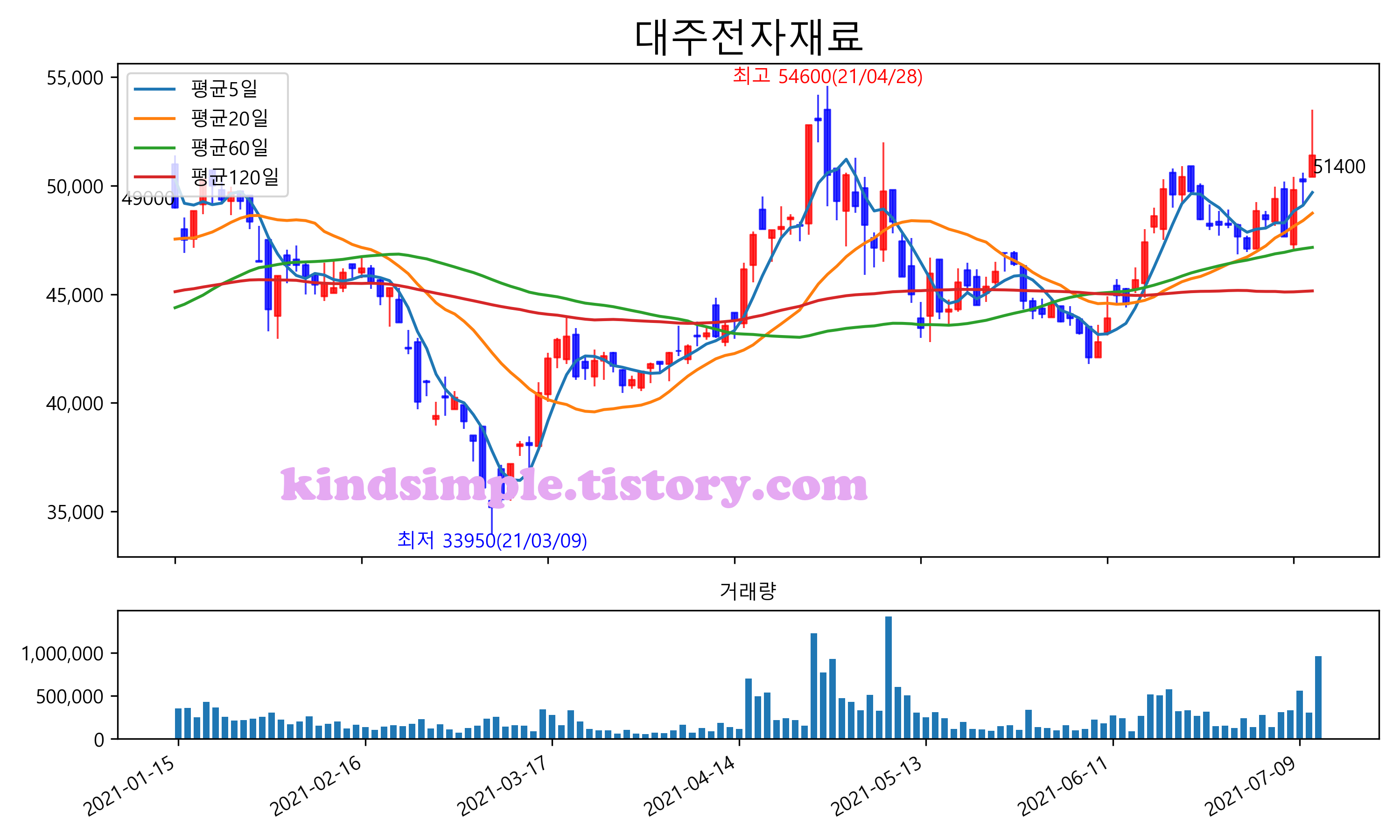 최근 6개월간 캔들차트 및 이동평균선입니다.