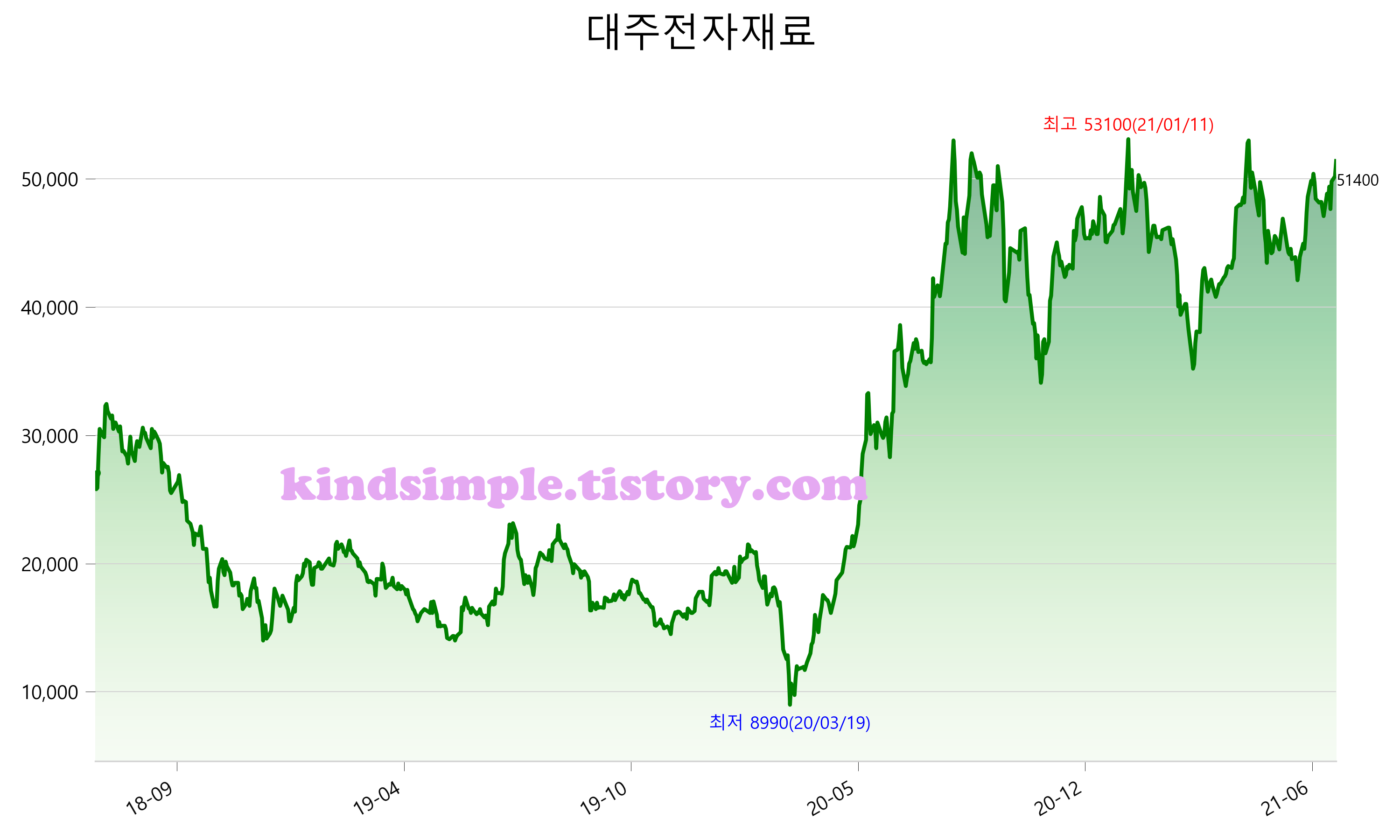 7월 14일 기준 주가는 51,400원 입니다. 아래는 최근 3년간의 주가흐름입니다.