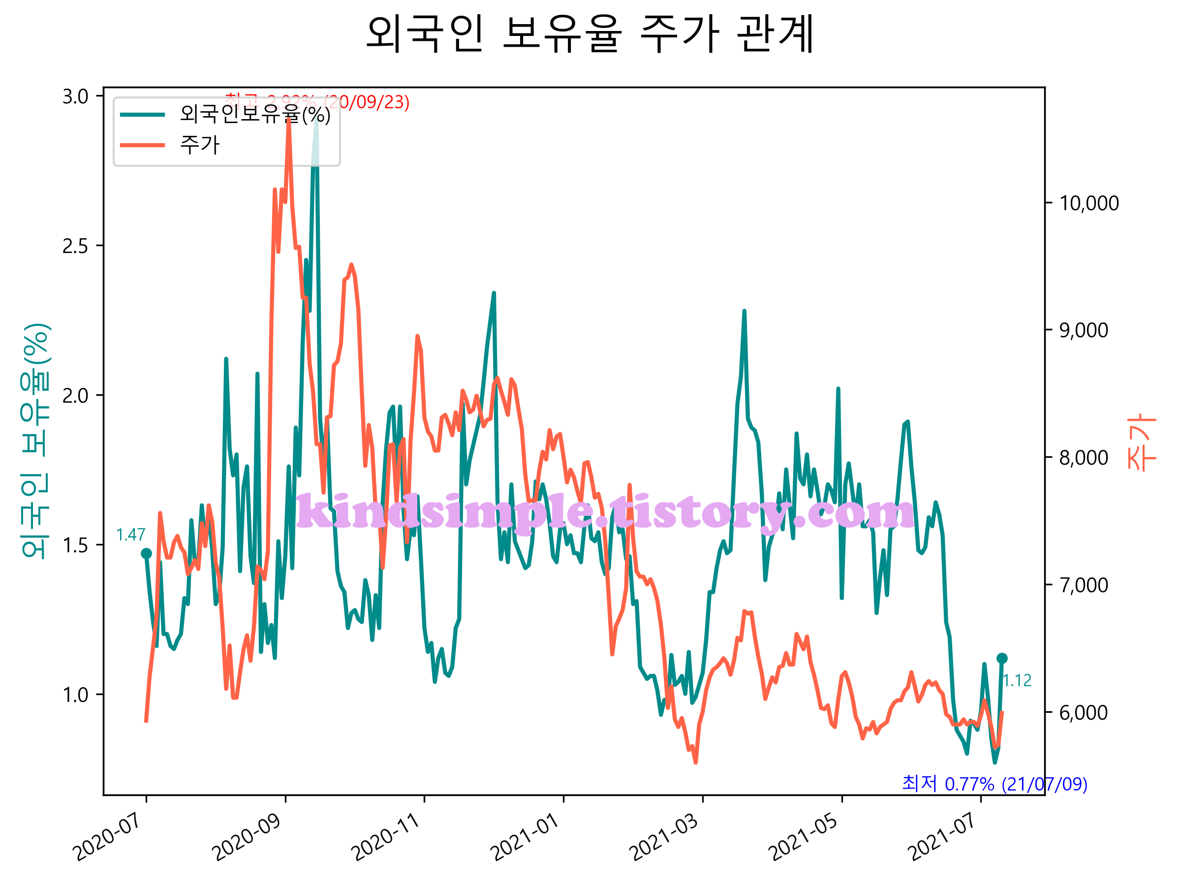 최근 1년간 외국인 보유율 및 주가와의 관계입니다.
