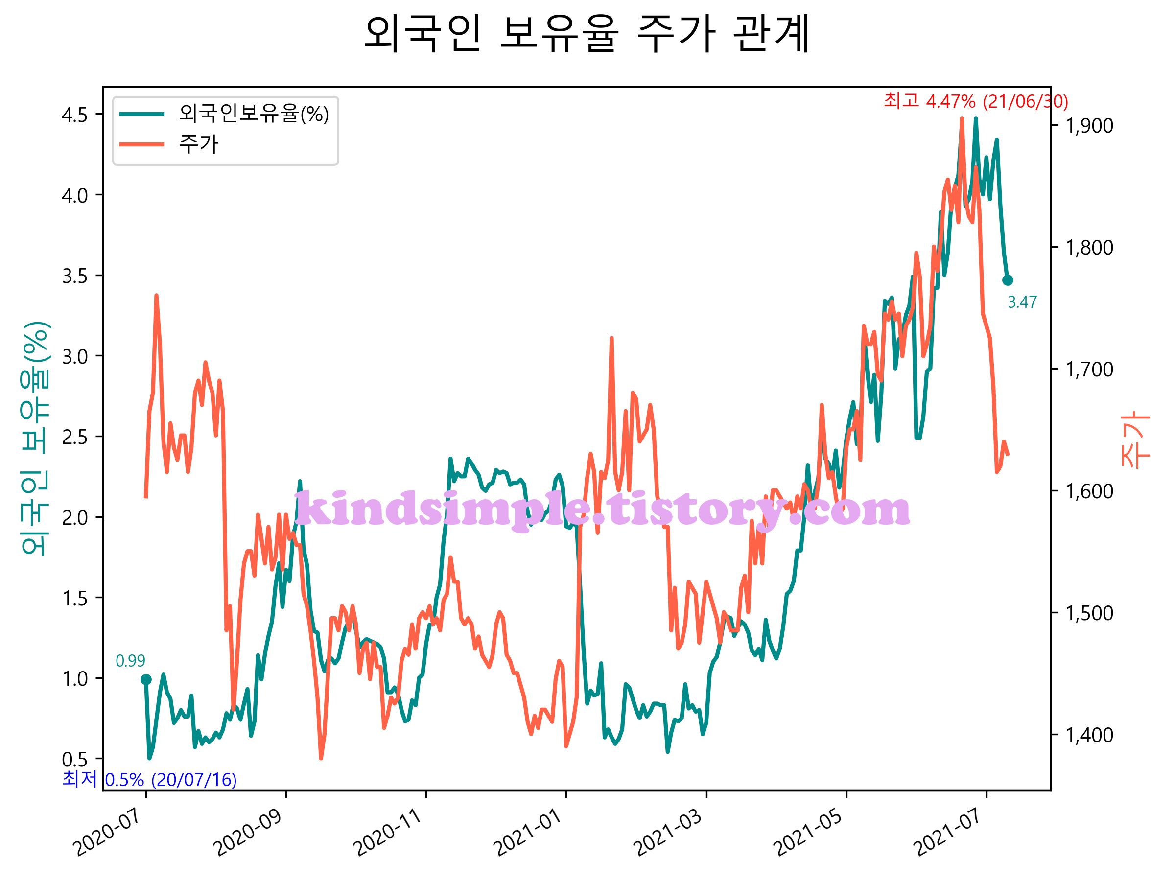최근 1년간 외국인 보유율 및 주가와의 관계입니다.