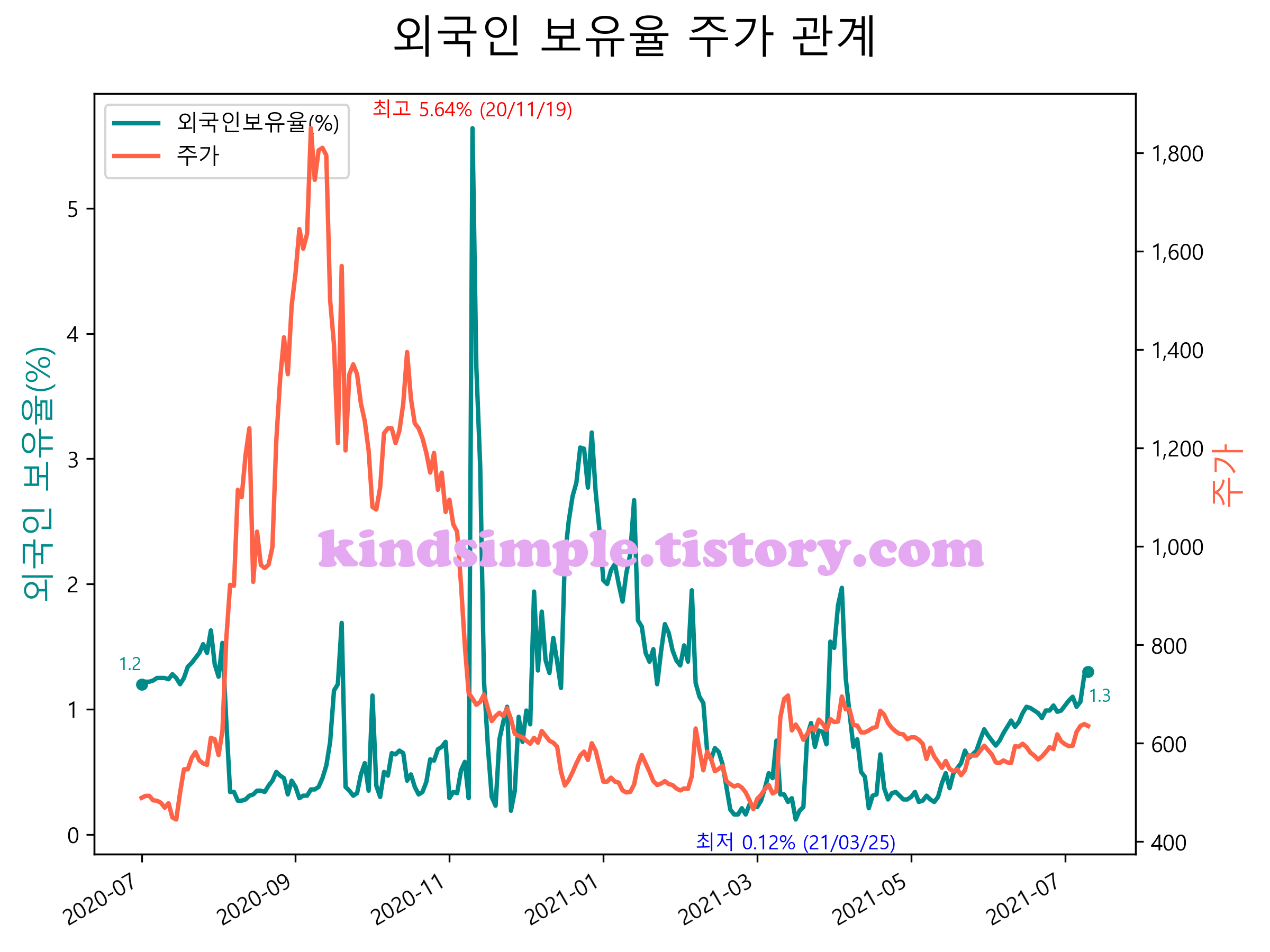 최근 1년간 외국인 보유율 및 주가와의 관계입니다.
