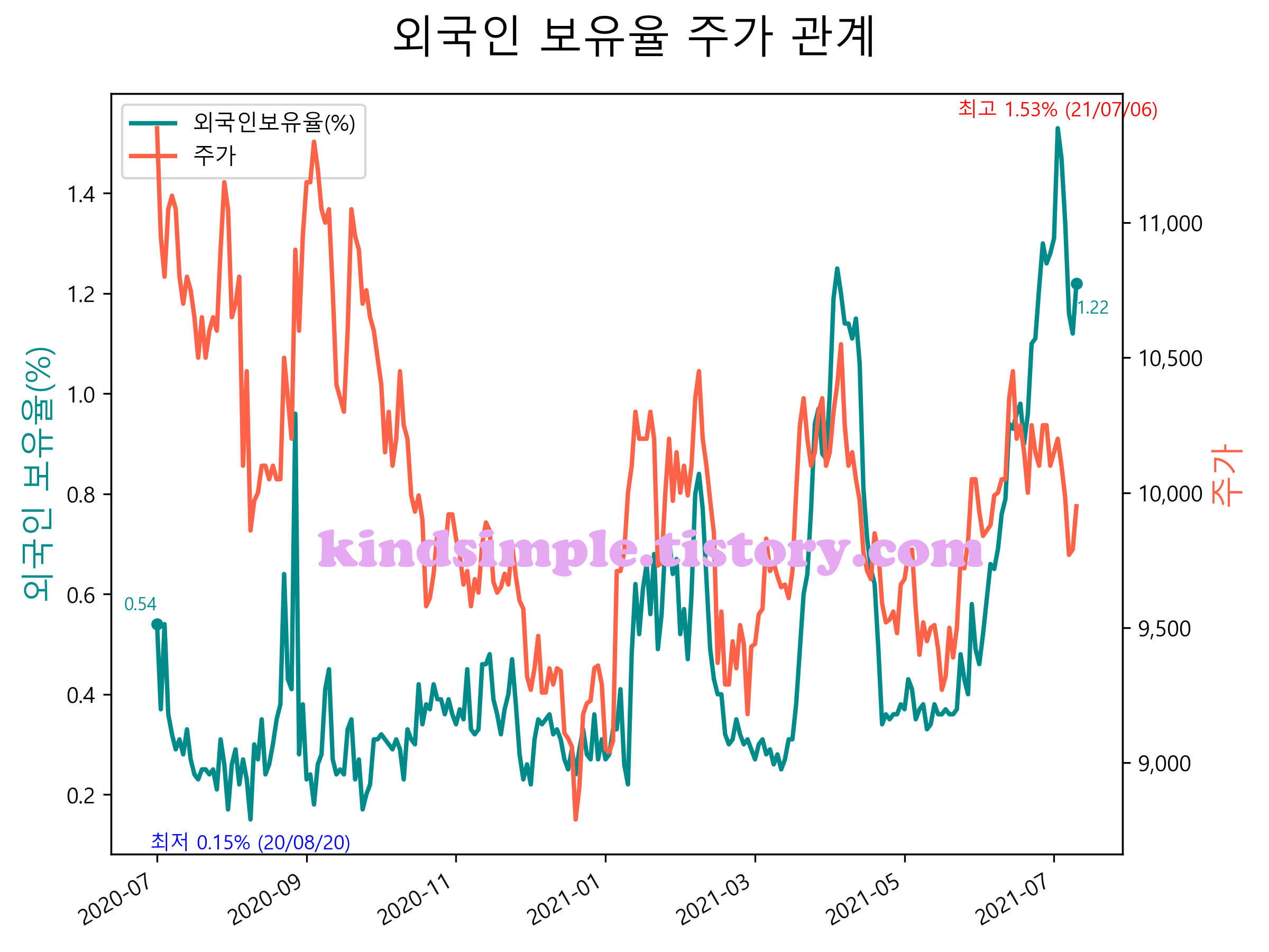 최근 1년간 외국인 보유율 및 주가와의 관계입니다.