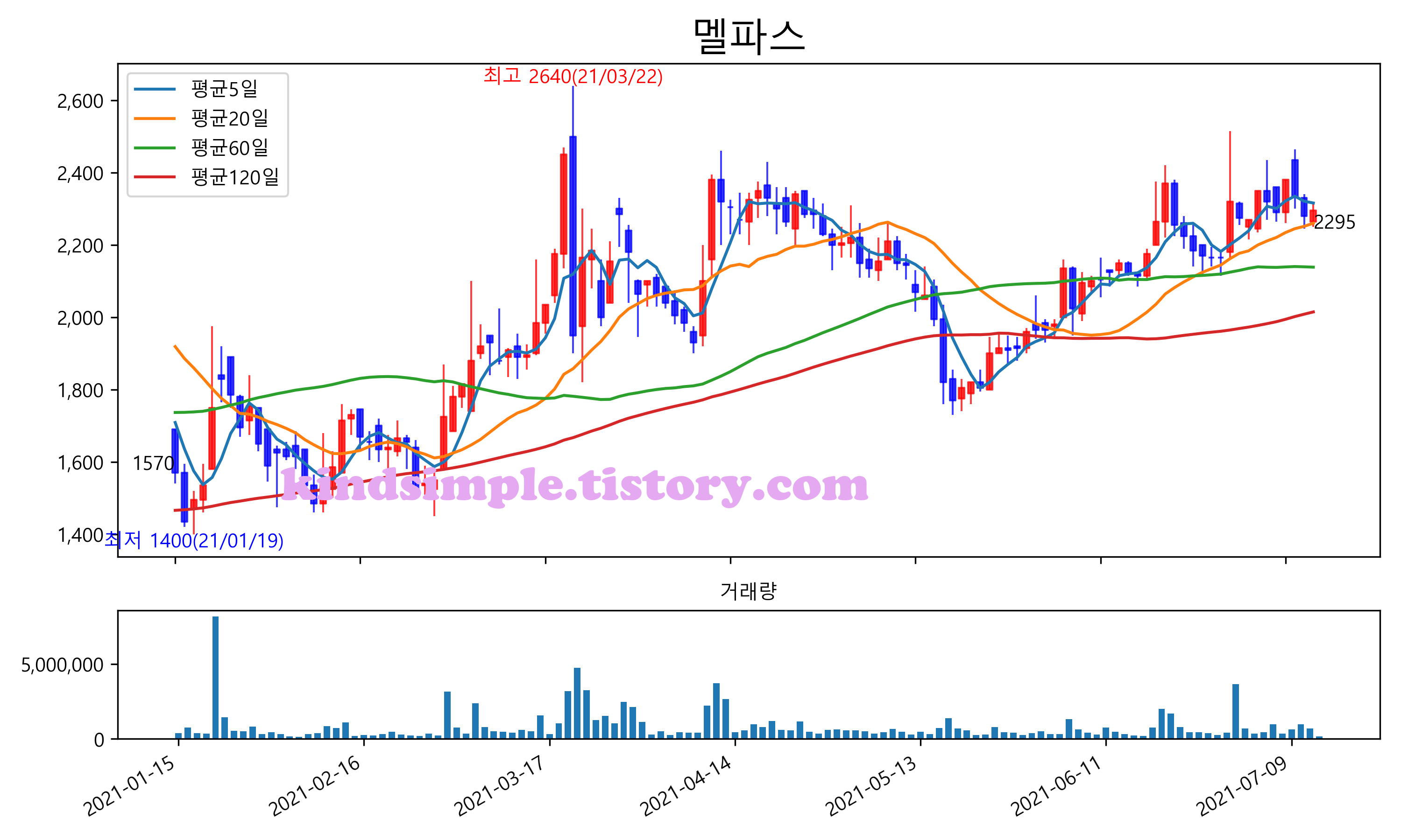 최근 6개월간 캔들차트 및 이동평균선입니다.