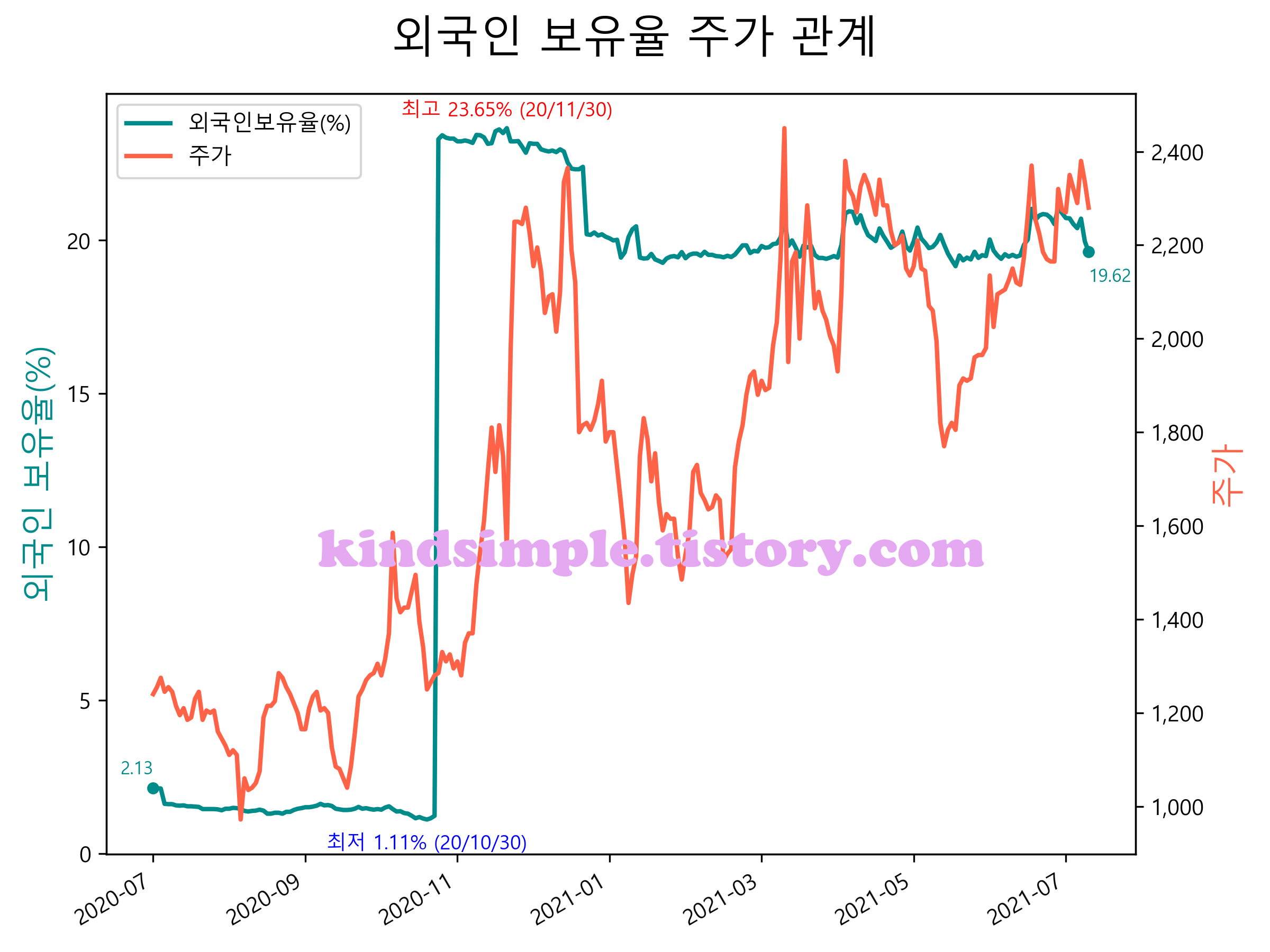 최근 1년간 외국인 보유율 및 주가와의 관계입니다.